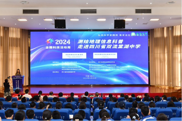 为大力弘扬科学家精神,普及测绘地理信息科学知识,激发全社会创新活力,推动新时代学生科学素质提升。5月30日,2024年全国科技活动周-测绘地理信息科普走进四川省双流棠湖中学隆重举行。本次活动由四川省测绘地理信息局指导,四川省测绘地理信息学会主办,四川省测绘地理信息行业产教融合共同体、四川水利职业技术学院、自然资源部应急测绘技术创新中心、自然资源部西南山地自然资源遥感监测工程技术创新中心、四川省地理国情与资源环境承载力监测工程技术研究中心、成都九江伟业科技有限公司共同承办,四川省双流棠湖中学(四川省海军青少年航空学校)约500余人参加了活动。