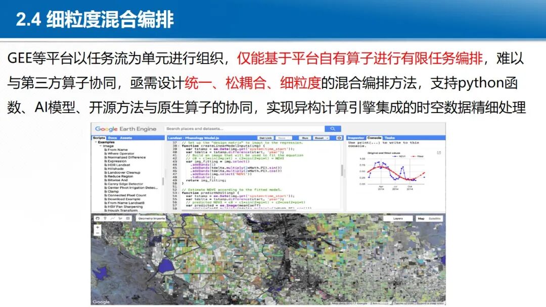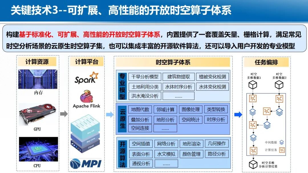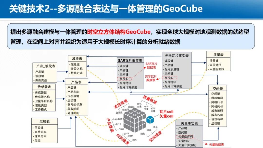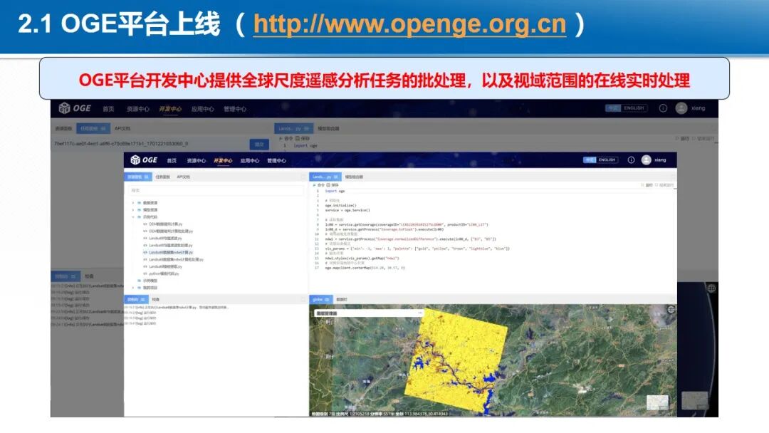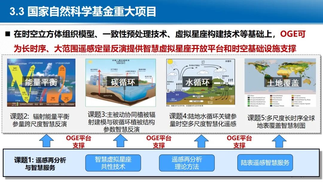 在大数据与云计算的背景下,地球时空大数据的处理范式正在发生深刻变革,各国均在积极构建新型时空信息基础设施。开放地球引擎(OGE)依托于云计算设施,以GeoCube时空立方体模型,动态汇聚与管理全球范围内的地球观测数据、数字高程模型、定量遥感产品、遥感AI样本、虚拟星座数据等多源异构时空数据。通过自适应划分和计算强度估计,实现大规模数据的负载均衡存储和复杂时空分析的负载均衡计算。基于可扩展的分布式时空计算框架,聚合地学分析领域的处理方法、分析算法与人工智能模型,从而实现了开放的数据集成、一体化的数据管理、高性能的时空计算和灵活的任务编排,提供标准化的数据就绪型、分析就绪型和决策就绪型时空信息智能服务体系。