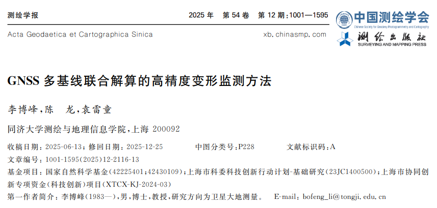 该成果以“GNSS多基线联合解算的高精度变形监测方法”为题发表于期刊《测绘学报》,论文第一作者为李博峰教授,第二作者为硕士生陈龙。该研究受到国家自然科学基金、上海市科委科技创新计划、上海市协同创新专项资金等科研项目资助。