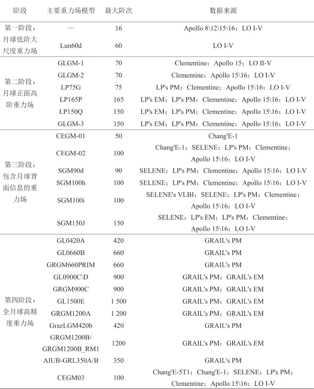 (2)梳理了探月以来的卫星观测计划,针对月球低阶大尺度重力场、正面高阶重力场、含月背信息的重力场、全月球高精度重力场几个阶段的观测数据及其对应的重力场模型和解算方法进行了较为全面的介绍。
