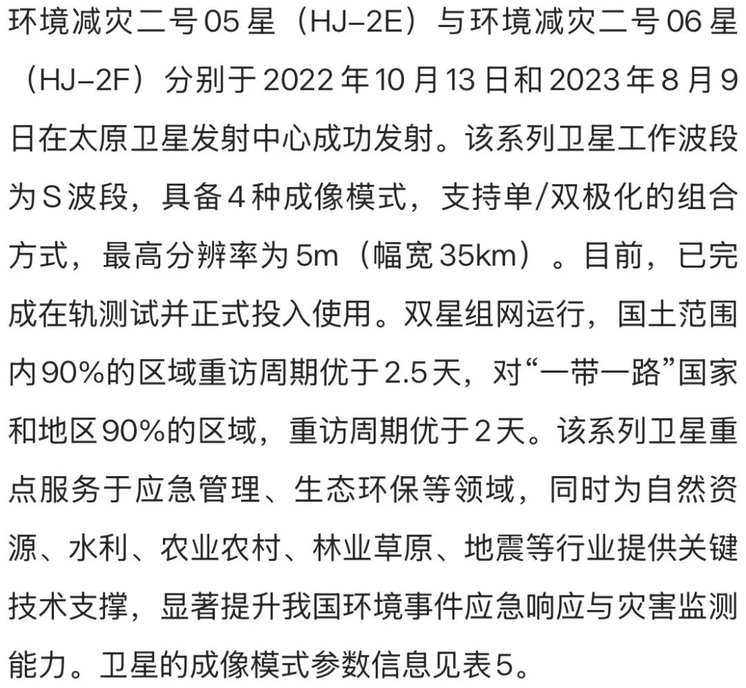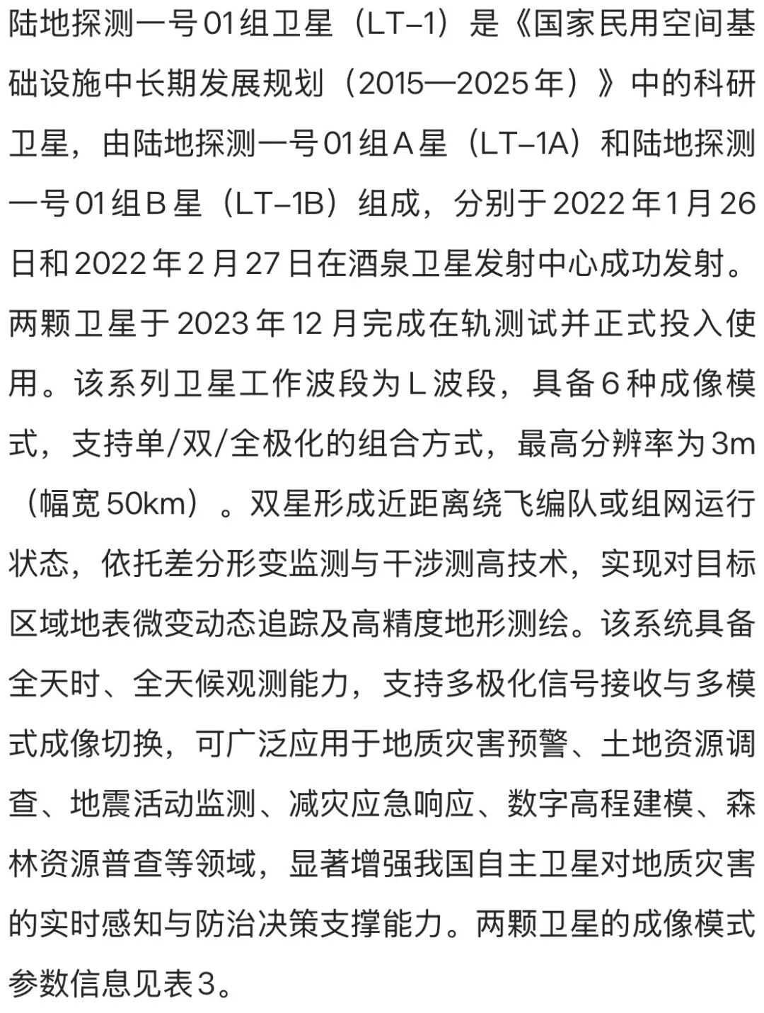 陆地探测四号01星(JZ-1)是《国家民用空间基础设施建设中长期发展规划(2015-2025年)》的科研卫星,于2023年8月13日在西昌卫星发射中心发射成功,是世界首颗地球同步轨道SAR卫星。该颗卫星工作波段为L波段,采用单极化方式,最高分辨率为20m(幅宽500km)。该卫星具备对中国大陆及周边区域全天时、全天候、高重访、宽覆盖的观测能力,可满足防灾减灾、国土资源勘察、地震监测及水利、气象、海洋、农业、环保和林业等行业应用需求。