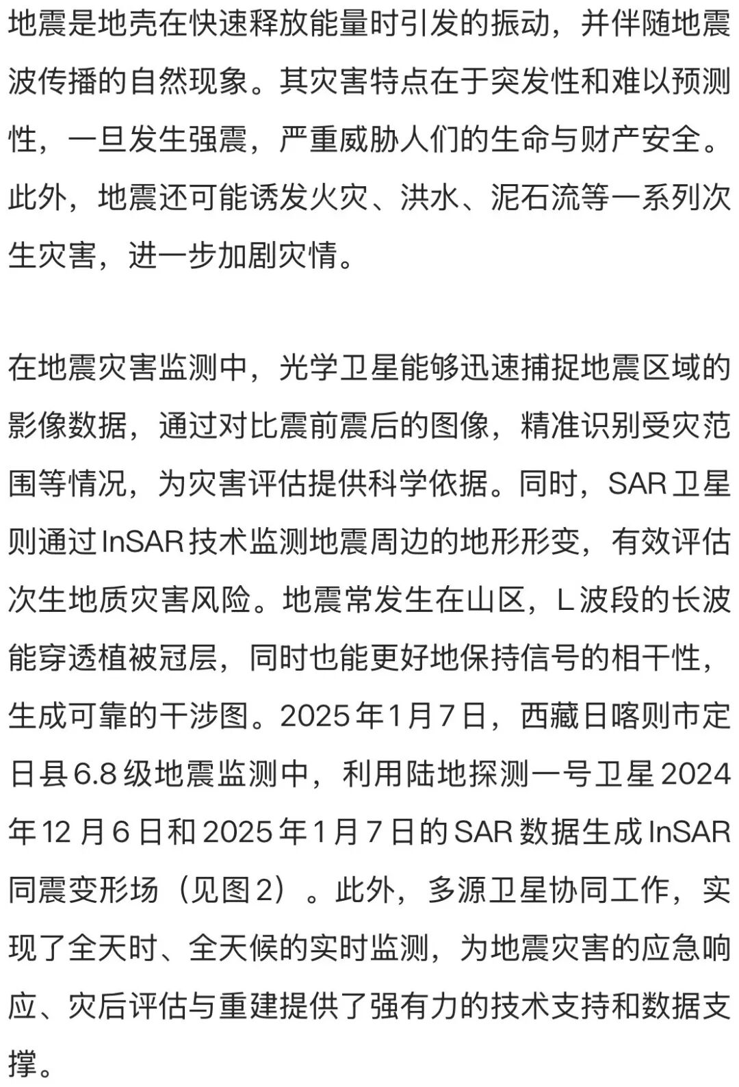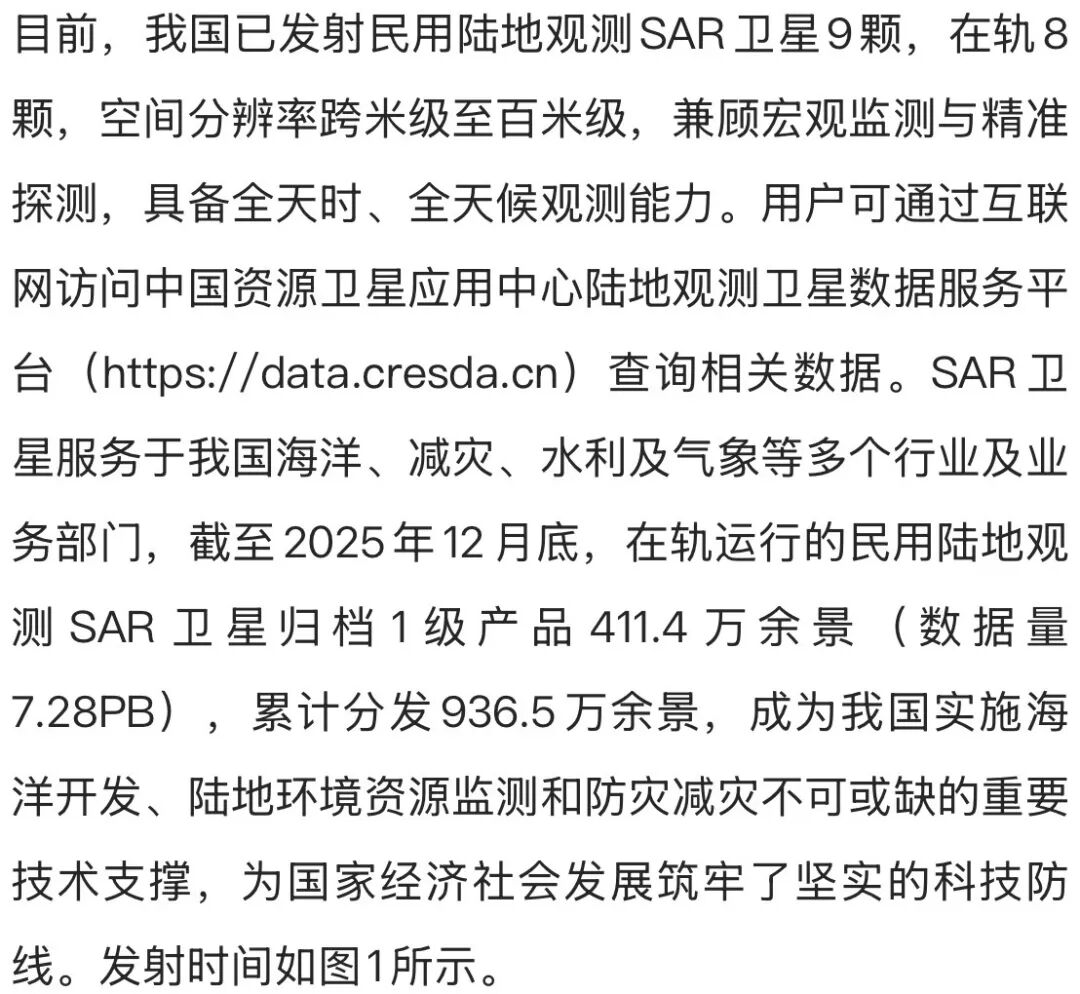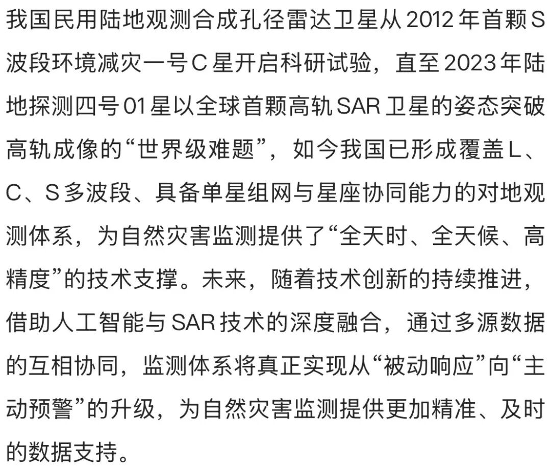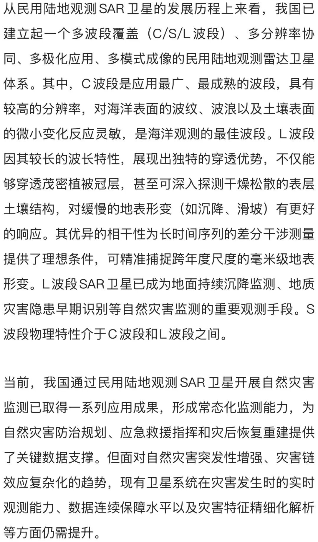 在全球气候变化加剧、极端天气事件频发的背景下,自然灾害的监测与预警已成为保障人类生命财产安全、推动可持续发展的关键命题。传统光学遥感卫星虽能提供高分辨率影像,却受制于天气与时间的限制,难以实现对灾害过程的连续、动态观测。合成孔径雷达(SAR)卫星凭借其全天时、全天候、穿透性观测优势,成为自然灾害监测的“利器”。近年来,我国民用陆地观测SAR卫星取得了显著进展,极大地提升了我国对地观测和自然灾害监测的能力。本文通过对民用陆地观测SAR卫星发展现状的系统介绍,分析了其在自然灾害监测领域中的典型应用案例与应用优势。