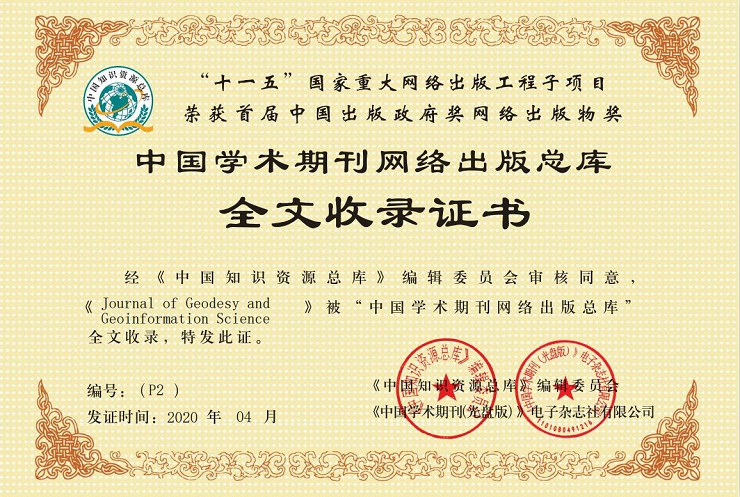 2020年4月,经《中国知识资源总库》编辑委员会审核同意,《测绘学报(英文版)》(Journal of Geodesy and Geoinformation Science,简称JGGS)被“中国学术期刊网络出版总库”全文收录。截至目前,《测绘学报(英文版)》已被中国学术期刊网络出版总库、中文科技期刊数据库、中国核心期刊(遴选)数据库国内三大学术文献数据库相继收录。