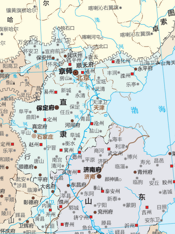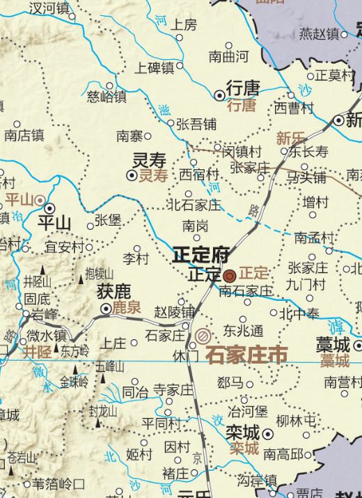 正定府的前身为真定府,这一名称变更发生在清代。顺治元年(1644年)改明朝的北直隶为直隶,领有顺天、永平、大名、顺德、广平、河间、保定、真定八府,延庆、保安两直隶州及宣府镇。顺治初置四巡抚、一总督,即顺天巡抚、保定巡抚、宣府巡抚、天津巡抚、宣大总督,至顺治十八年(1661年)仅存保定巡抚。康熙六年(1667年)改保定巡抚为直隶巡抚,康熙八年(1669年)移治保定府,并设守、巡二道,康熙五十四年(1715年)直隶巡抚加总督衔。雍正元年(1723年)置热河厅,“真定”因避讳而改为“正定”。这一地名的演变过程,清晰地体现在清初直省府厅州县和直隶中南部两幅图的对照之中。图/《清史地图集》