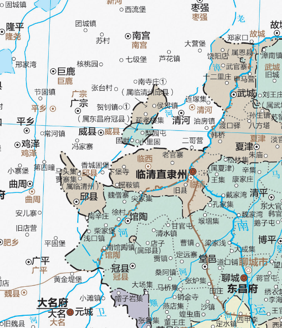 在考证政区界线的过程中,项目组还发现了若干有趣现象,在此仅举一例。学术界素有“义和团起源于山东”的说法,原因是义和拳起源于山东冠县梨园屯。但在研制《清史地图集》的过程中,笔者考证得知,梨园屯原来是山东冠县的一块飞地,具体位置在直隶省威县境内。因此,从《清史地图集》可以稍加修正学术界流行的说法:义和团的起源地应是山东、直隶两省交界地带,而非仅起源于山东。