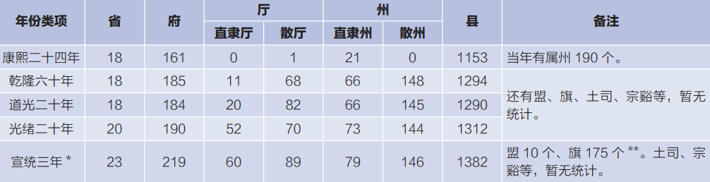 *注:含台湾省,台湾省政区为光绪二十年数据(府3个、直隶州1个、散厅3个、县11个)。