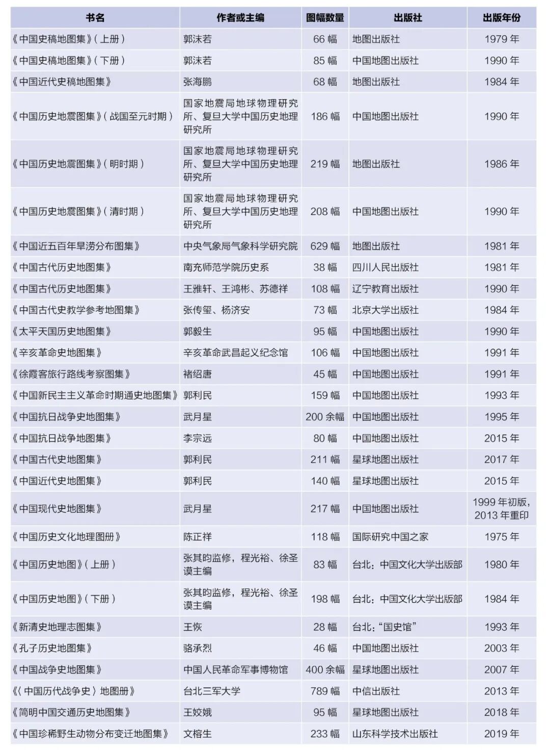 多年来,笔者在国外阅览62种外文历史地图集,认为学术意义上的历史地图集应该有综合、区域、专题、时段(断代)4个发展方向。在62种外文历史地图集中,区域性历史地图集数量最为丰富,达27种;专题性历史地图集数量相对有限,有15种;综合性历史地图集因需以区域、专题类成果作为研究基础,数量更少,有14种;而断代历史地图集(即特定时段的历史地图集)最为稀缺,仅6种。对照国际历史地图集发展现状,国内历史地图集的编绘亦已初具规模:截至2019年10月,全国综合性历史地图集有谭图、《中华人民共和国国家历史地图集》2种;专题性历史地图集亦颇有建树,有24种;区域性历史地图集包含11个省级行政区的14部省级历史地图集,未来有望逐步覆盖全国所有省级行政区;而断代历史地图集仍然付阙。