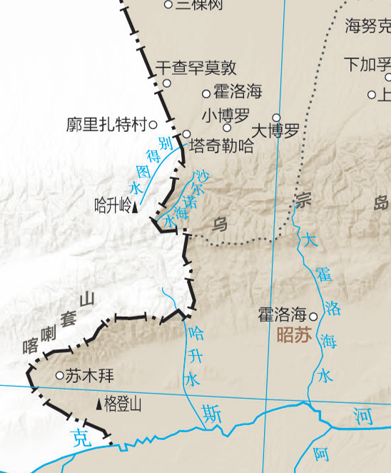 格登山位于今新疆昭苏县西南特克斯河北岸。乾隆二十年(1755年),清政府两路出兵伊犁,大破准噶尔部总台吉达瓦齐叛军于此。达瓦齐率残部逃至乌什城,被乌什城伯克渥集斯擒献清军,随后叛乱被平定。新疆中部图选取了格登山这一重要历史事件发生地加以标注。图/《清史地图集》