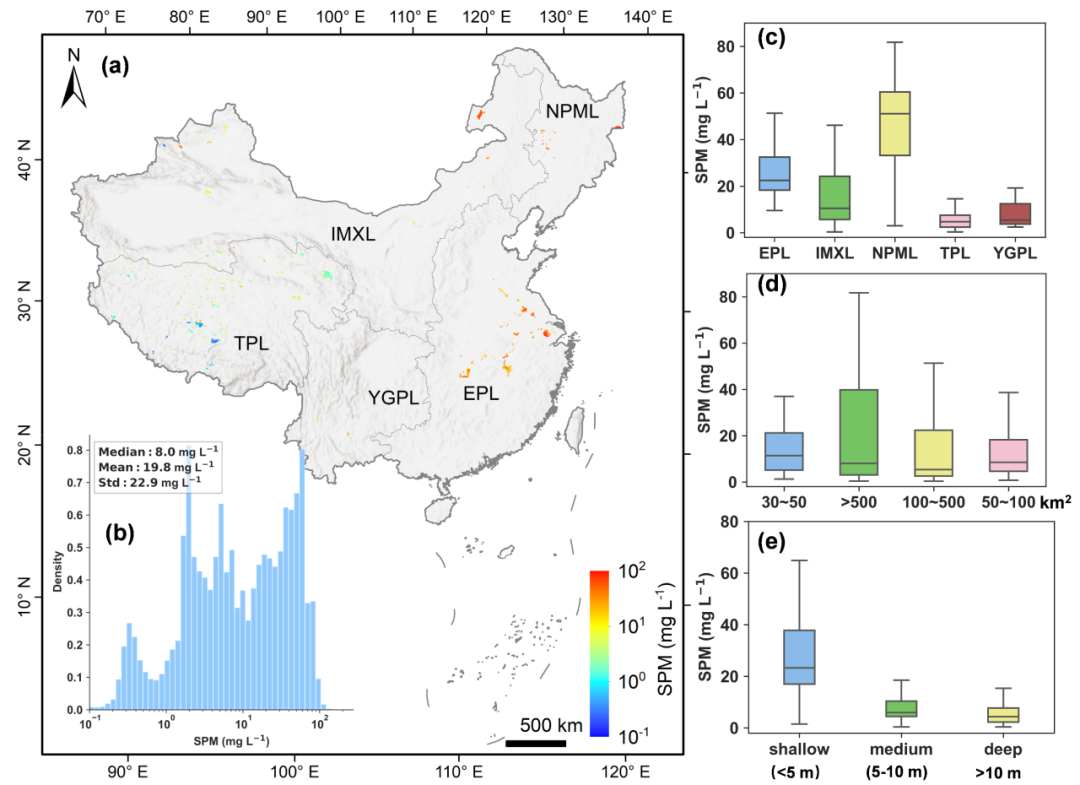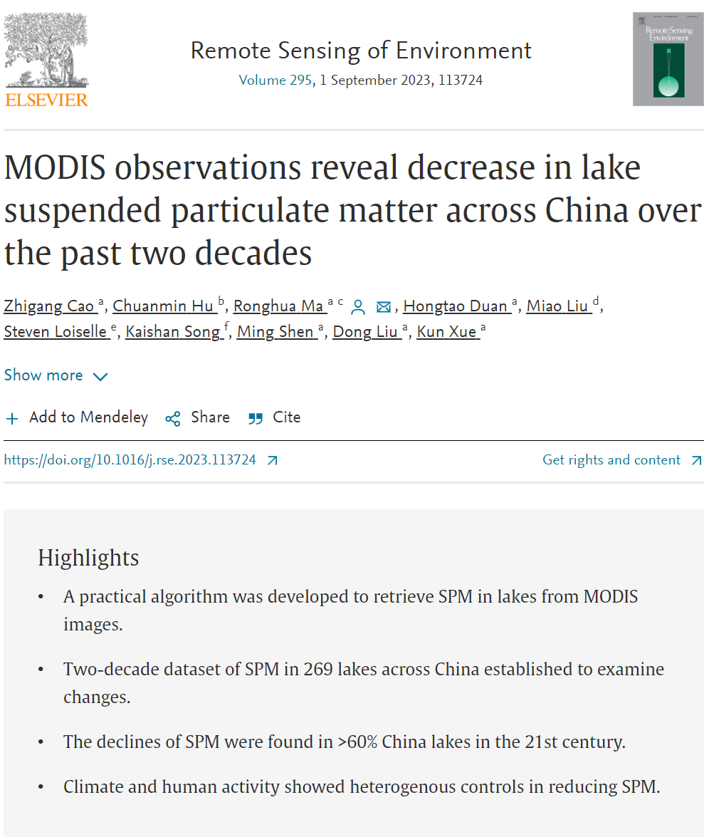 近日,中国科学院南京地理与湖泊研究所马荣华研究员课题组成员曹志刚博士联合南佛罗里达大学、锡耶纳大学、中国科学院东北地理与农业生态研究所等科研人员,基于长期以来的实测调查数据,发展了基于MODIS卫星数据的中国湖泊悬浮物反演算法,揭示了2002年以来中国30k㎡以上中大型湖泊的悬浮物时空变化和影响因素。研究成果以“MODIS observations reveal decrease in lake suspended particulate matter across China over the past two decades”为题,近期发表在遥感顶级期刊《Remote Sensing of Environment》上。