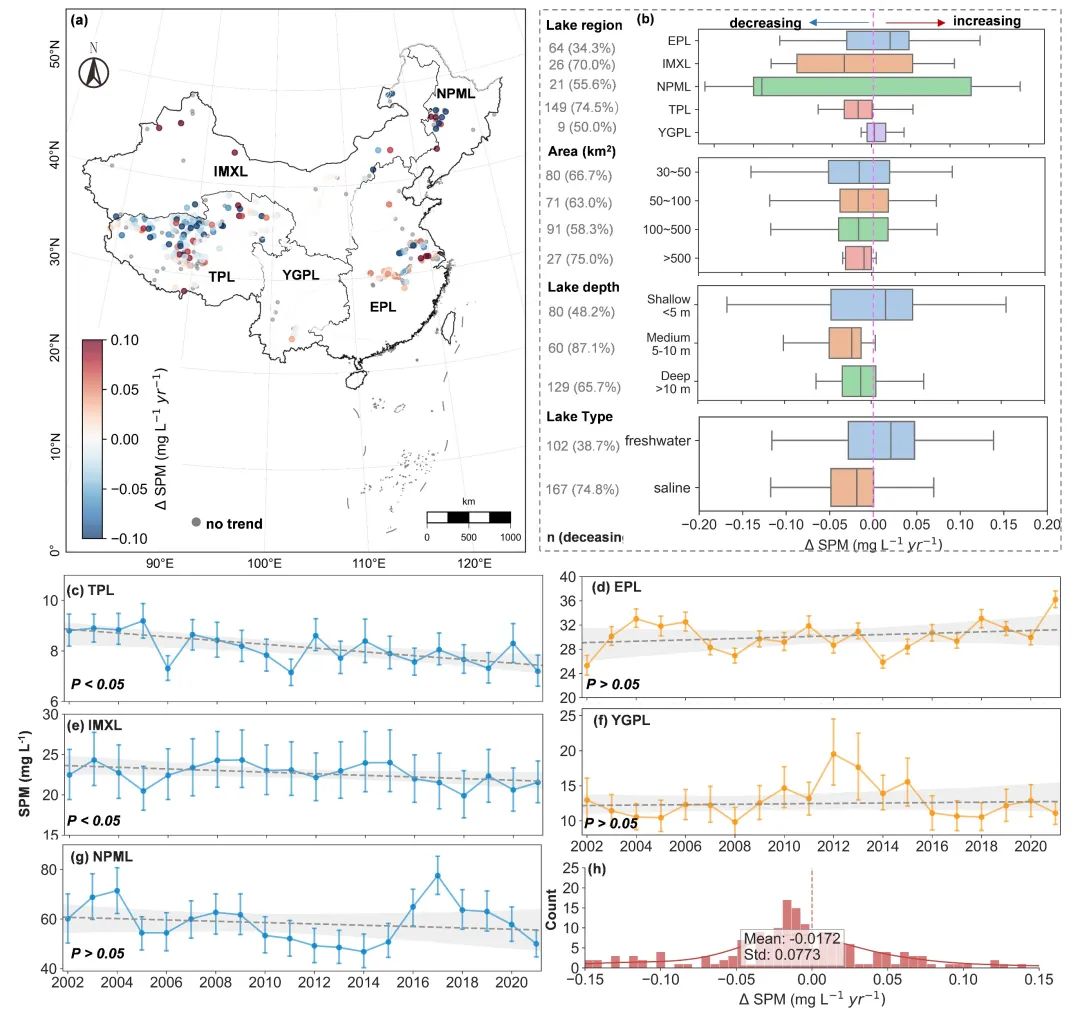 图2 2002--2021年中国湖泊SPM的年际变化趋势分布与统计