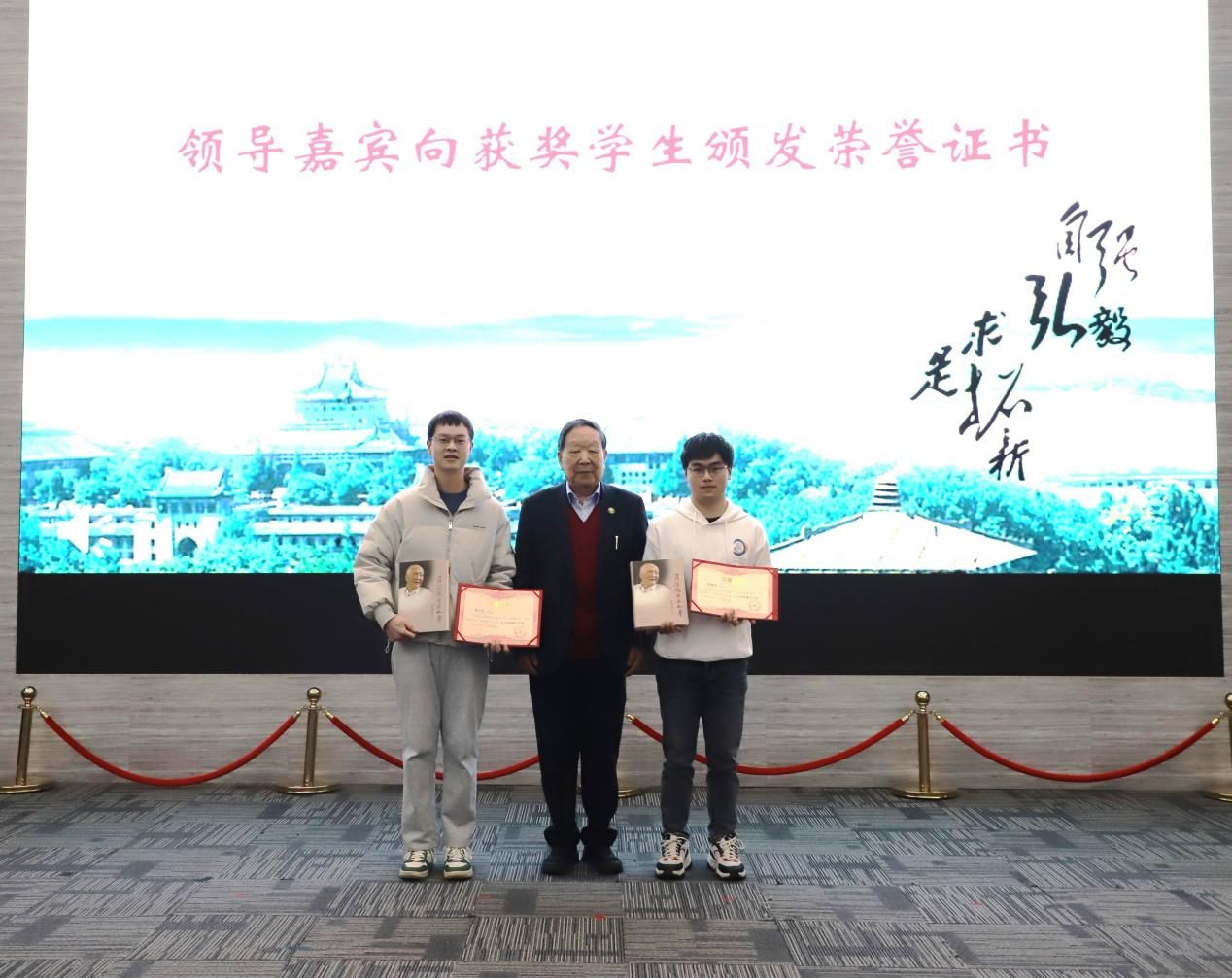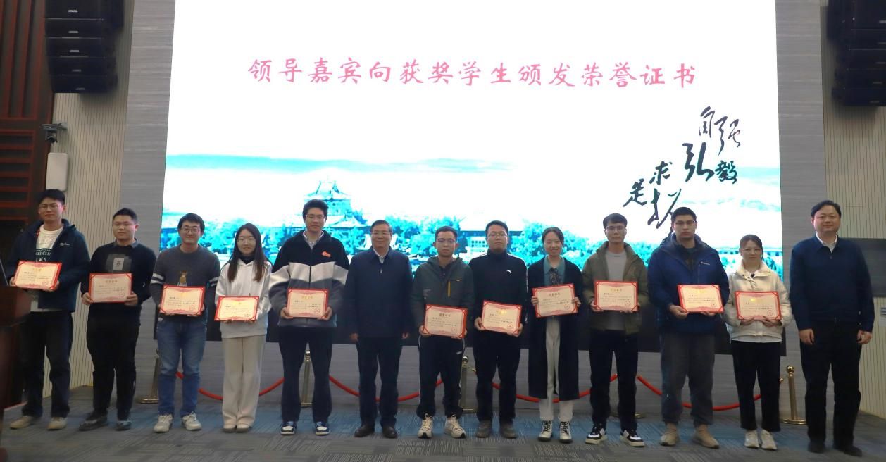 与会领导嘉宾为获奖学生颁发荣誉证书,李德仁院士将亲笔签名的《资深院士王之卓》一书赠予博士生特等奖获得者。