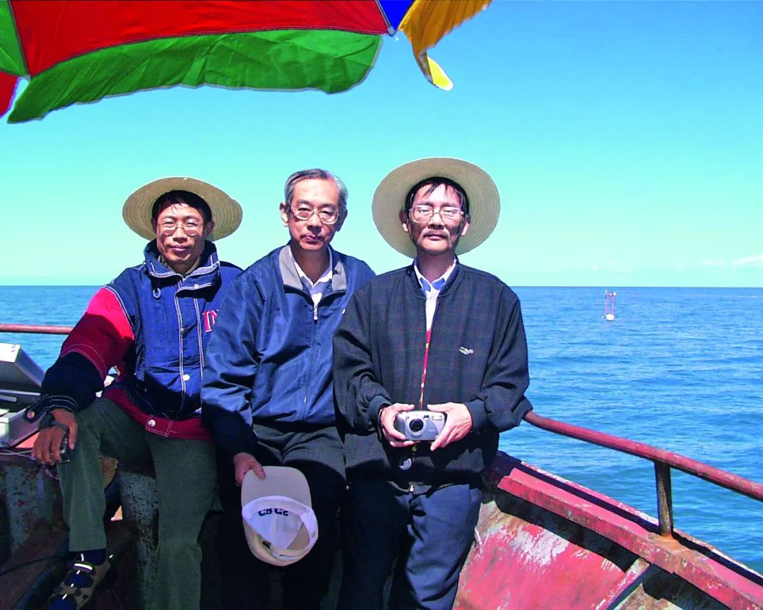 ·顾行发(左)和国家卫星气象中心研究员邱康睦(中)、中国科学院院士李小文到青海湖工作。