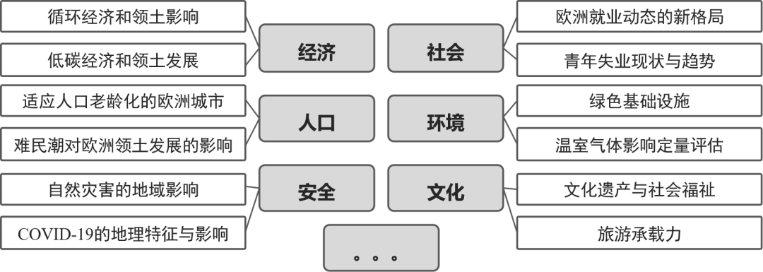 2、多样化的社会经济主题。ESPON关注多样化的社会经济发展,主题涵盖经济、社会、人口、环境、文化、安全等领域。这些主题在指标体系的构建上也得到了体现,其中领土状况评价指标体系包括了经济财政和贸易发展、人口与居住环境、科学技术、政府管理、劳动力市场、国土结构、教育、贫困/社会包容、健康与安全、旅游、信息社会、农业与渔业、EU 2020指标、交通可达性、环境与能源等方面。通过这些指标,ESPON不仅可以了解社会经济各个领域的情况,还可以评估政策实施的效果以及政府公信力等相关内容。这些主题不仅聚焦整个欧盟领土,也关注4个伙伴国、不同功能区域以及宏观区域等多个地理单元。