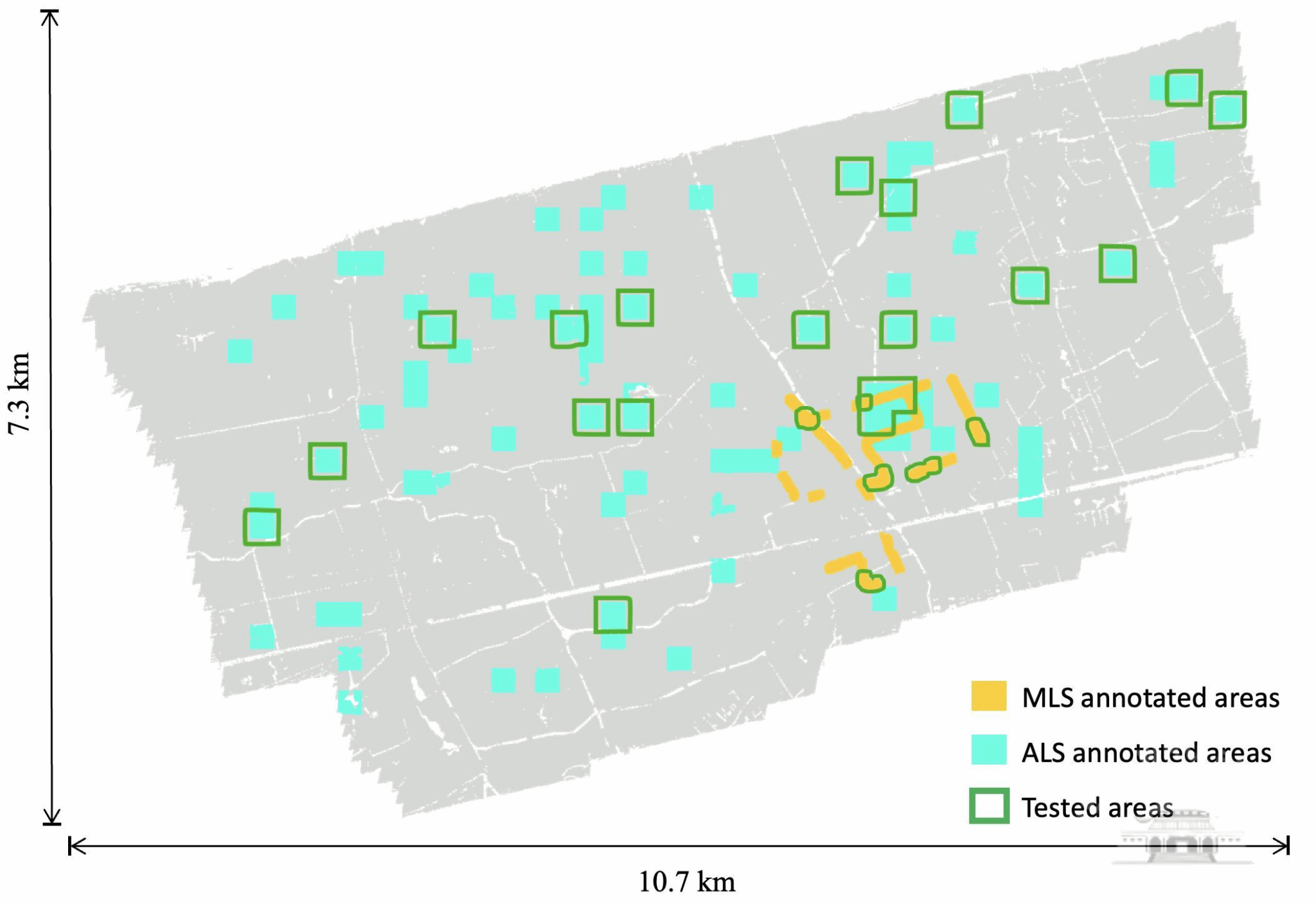 杨必胜教授课题组通过多年实景三维中国和新型基础测绘工程项目的积累,构建了空间范围覆盖近70平方公里,涵盖机载平台点云、车载平台点云及全景影像等多源数据的WHU-Urban3D点云数据集。该数据集在以下方面形成了突破:丰富的逐点语义实例标注,提供了超过6亿点的语义实例标注,地物类别超过30余种,为各类点云深度学习模型提供了高质量的训练样本和测试数据;复杂的城市场景覆盖,涵盖了上海和武汉两个大规模城市场景的空中机载平台和地面车载平台的点云,为多模态点云的语义和实例深度学习方法的评测提供了权威参考;涵盖了同一区域的跨平台点云的准确标注,首次为点云跨域深度学习方法提供了可靠的测试和参考。