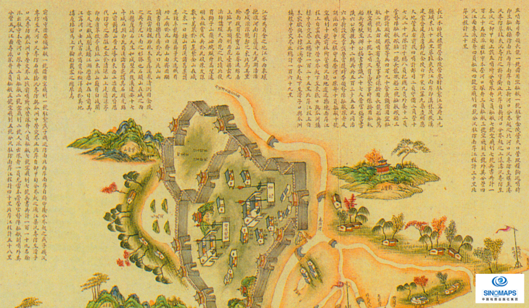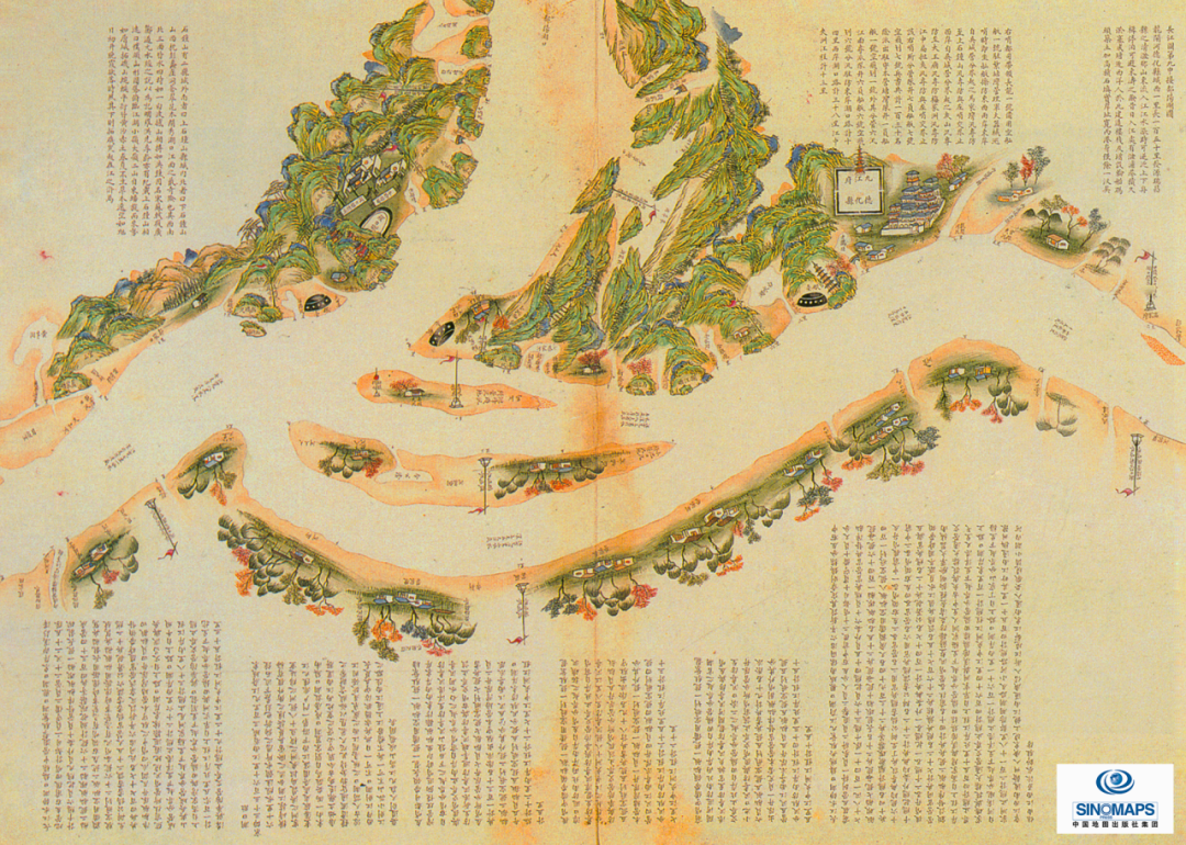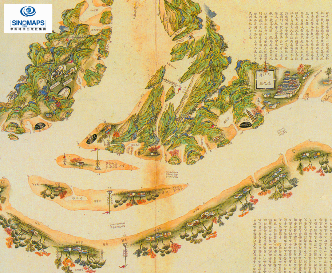 该图册采用中国传统平立面结合的形象画法,详细而生动地描绘长江中游至入海口段江水的宽深、江中沙洲、两岸支流以及沿江两岸的山峰、城镇、炮台等自然和人文地理景观。