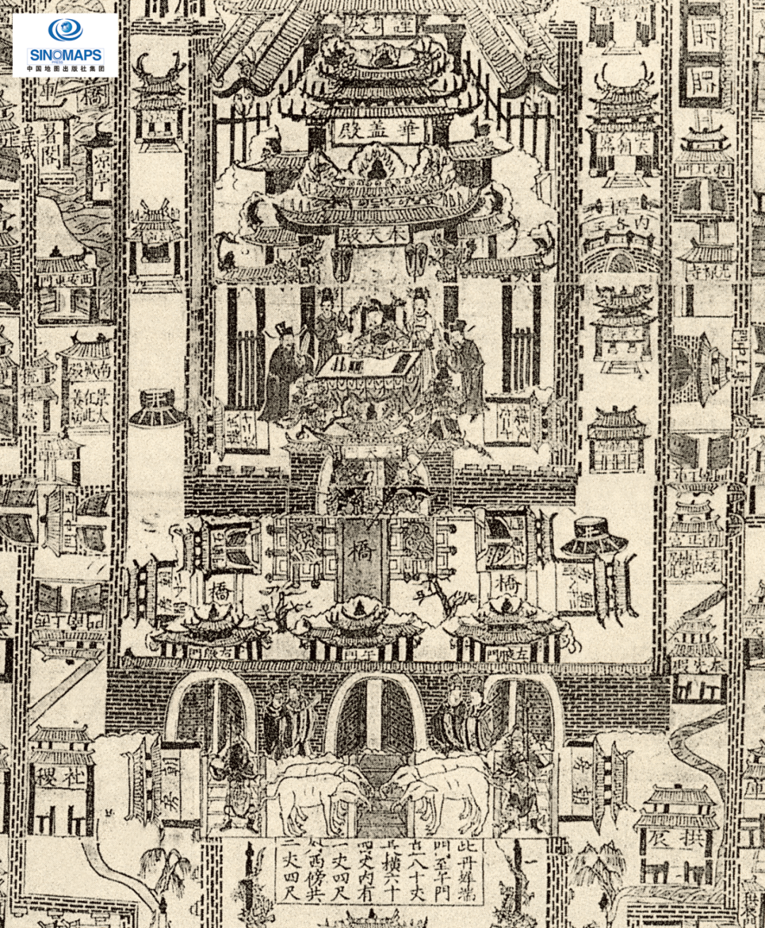 图中一些建筑上附有文字注记,其中午门前注有“此丹墀端门至午门直八十丈长,横六十四丈,内有一丈四尺□西傍共二丈四尺”;奉天殿前东西文武楼处注有“十二丈”,在南正宫注有“正统王位□梁居此”;南城殿注有“景太(秦)在此养病”;在左右腋门后的建筑中分别注有“朝房二十八间”“朝房二十间”等字。