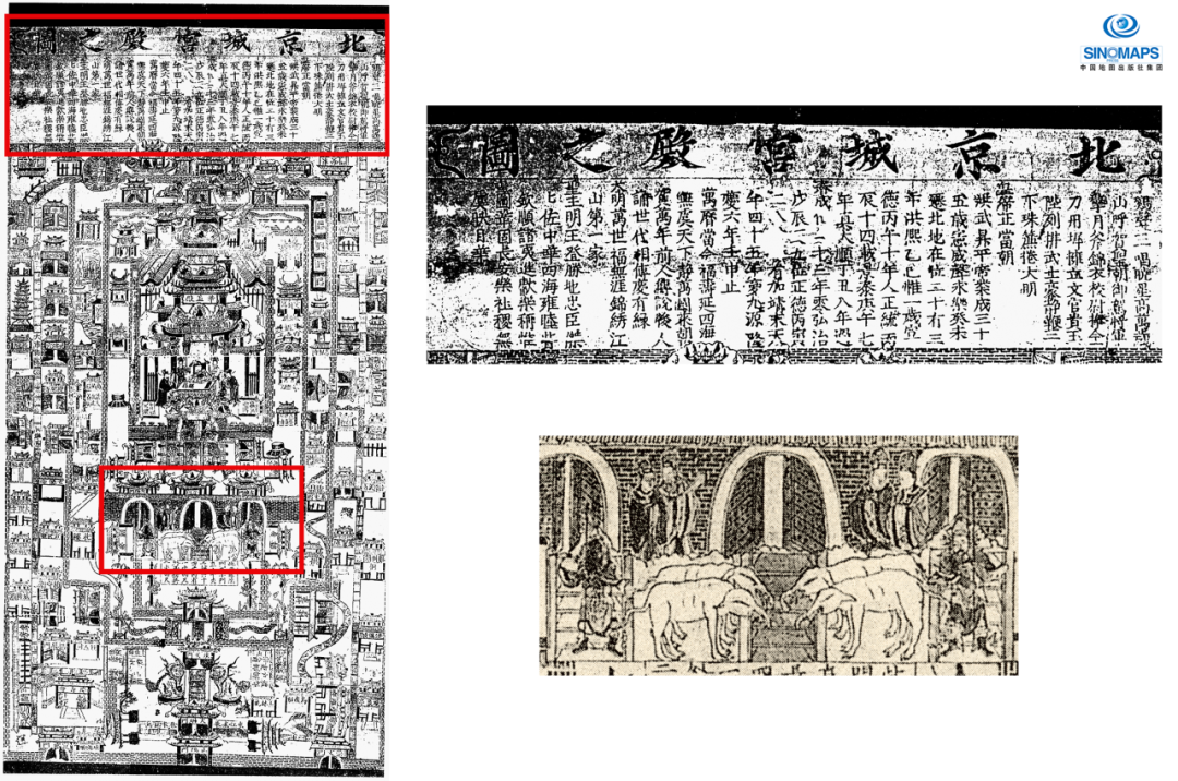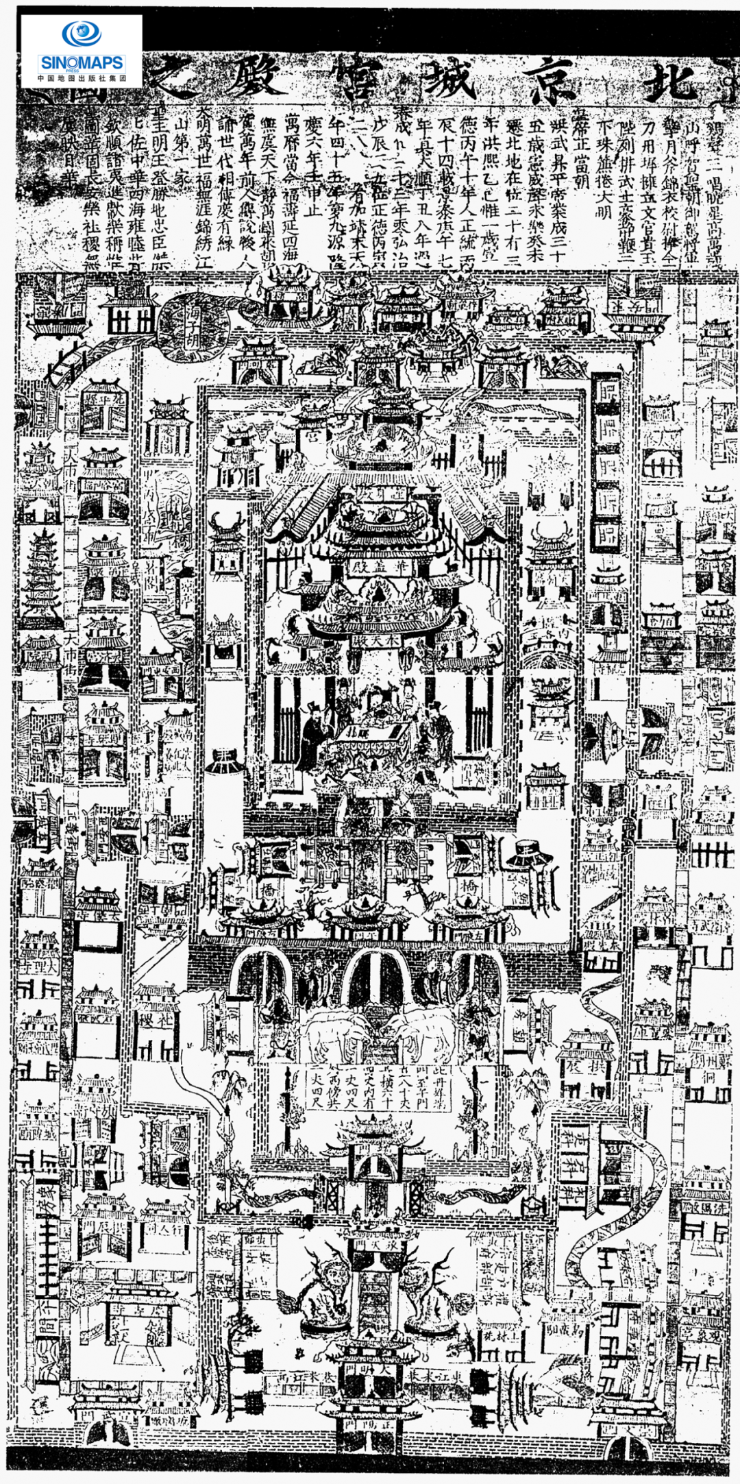 《北京城宫殿之图》上端刻有图名。中间有文字30行,以歌谣形式把明朝自洪武至万历各代皇帝的年号和在位时间扼要表示出来。下端为北京城宫殿图。