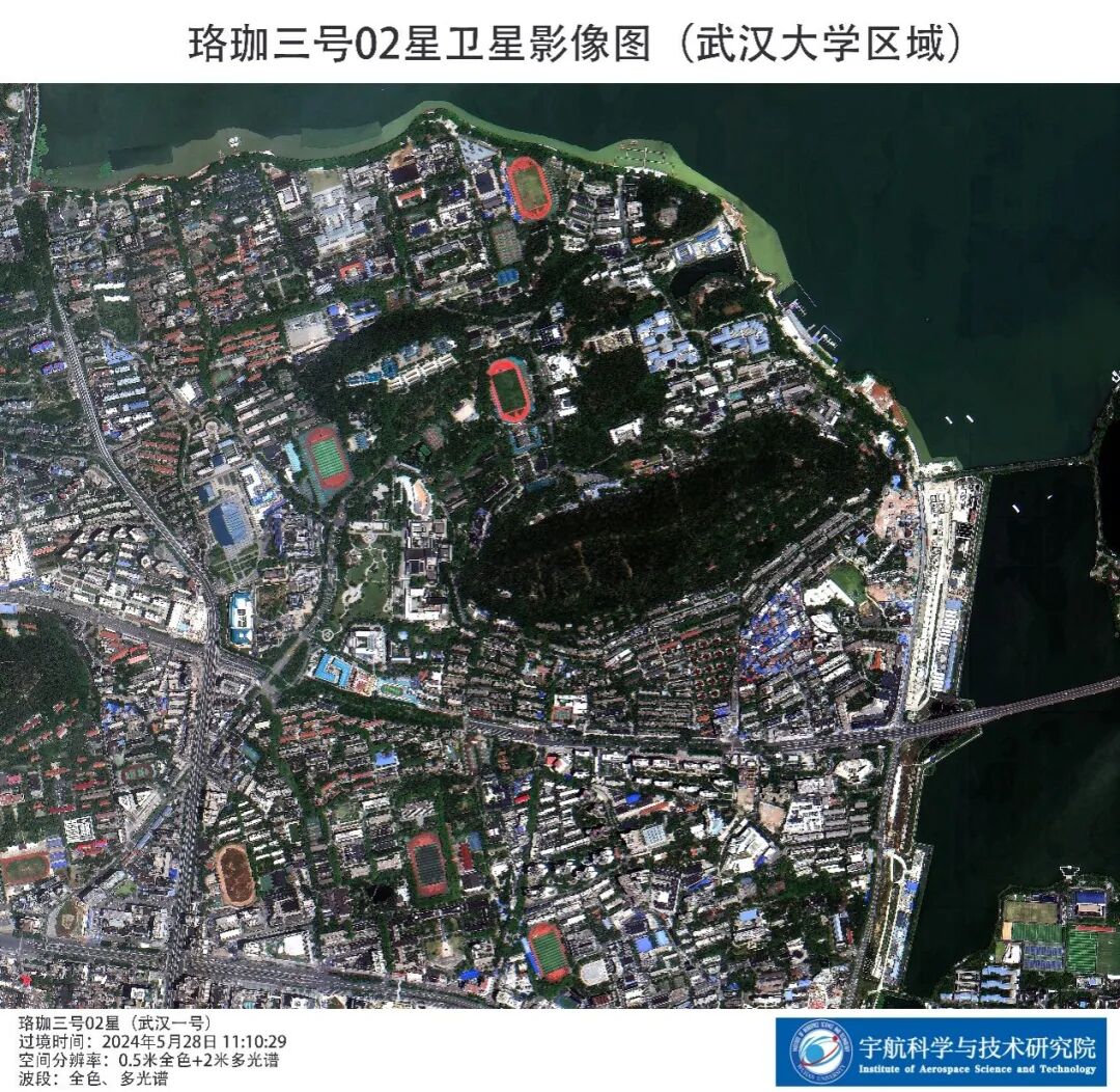 继5月21日中午12时15分“珞珈三号02星(武汉一号)”发射成功顺利进入预定轨道后,入轨即工作,不到12小时,武汉大学遥感卫星地面站成功接收卫星获取的首组影像,影像拍得清、定位准、传输快。5月28日珞珈三号02星过境武汉上空,成功对武汉市局部区域进行拍摄并获取高质量的遥感影像数据,武汉大学文理学部、工学部、信息学部等区域全部有效覆盖。