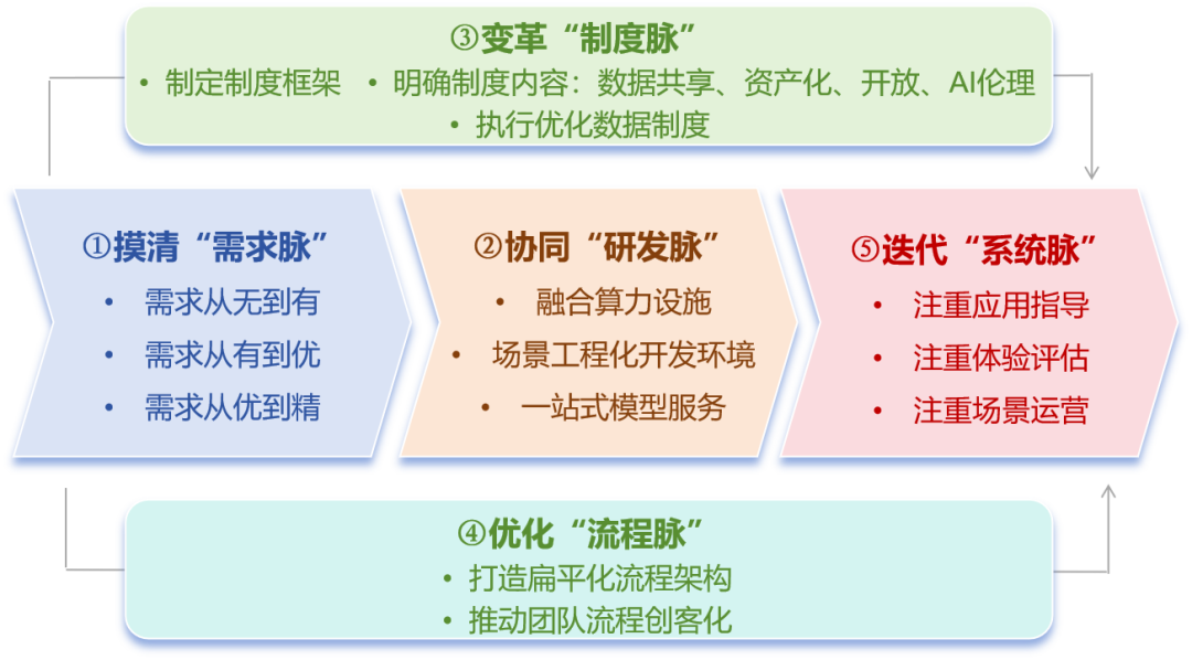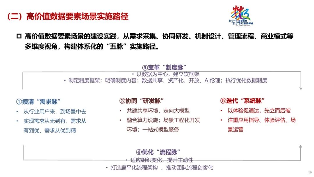 二是高价值数据要素场景建设需要秉持“五脉”实施路径。高价值的数据要素场景,并不只是简单的考虑新技术应用,也不是单一的数据架构搭建和全周期管理,而是需要从需求采集、协同研发、机制设计、管理流程、商业模式等多维度视角出发,构建体系化的“五脉”实施路径。具体而言,要做好如下五点:摸清需求脉,坚持从行业用户来,到场景中去。协同研发脉,共建共享环境,走向大模型。变革制度脉,以数据为中心,建立软框架。优化流程脉,适应组织变化,提升团队主动性。迭代系统脉,以体验促通达,先立而后破。