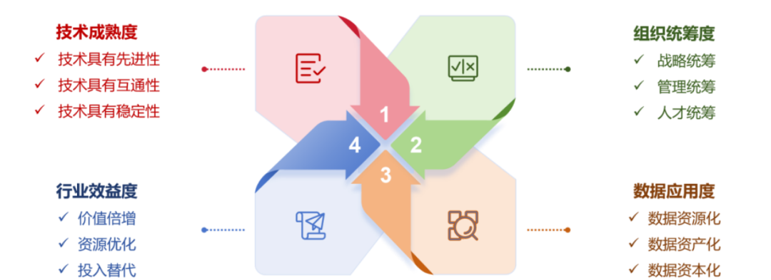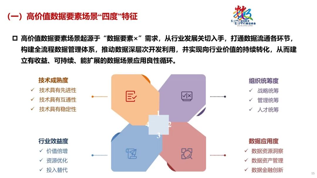 一是高价值数据要素场景的“四度”特征。基于腾讯、中国电子等企业在数据要素开发利用中积累的行业经验,研究团队对市场认可度较高、已经形成价值闭环的数据要素场景进行了分析提炼,提出了数据要素场景的“四度”分析框架,即:技术成熟度、组织统筹度、数据应用度、行业效益度。这个分析框架既可以作为检验数据要素场景的价值标尺,又可以为政策支持方向选择提供方法论参考。