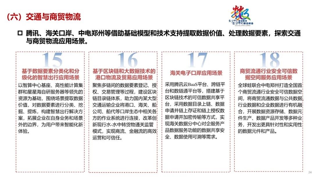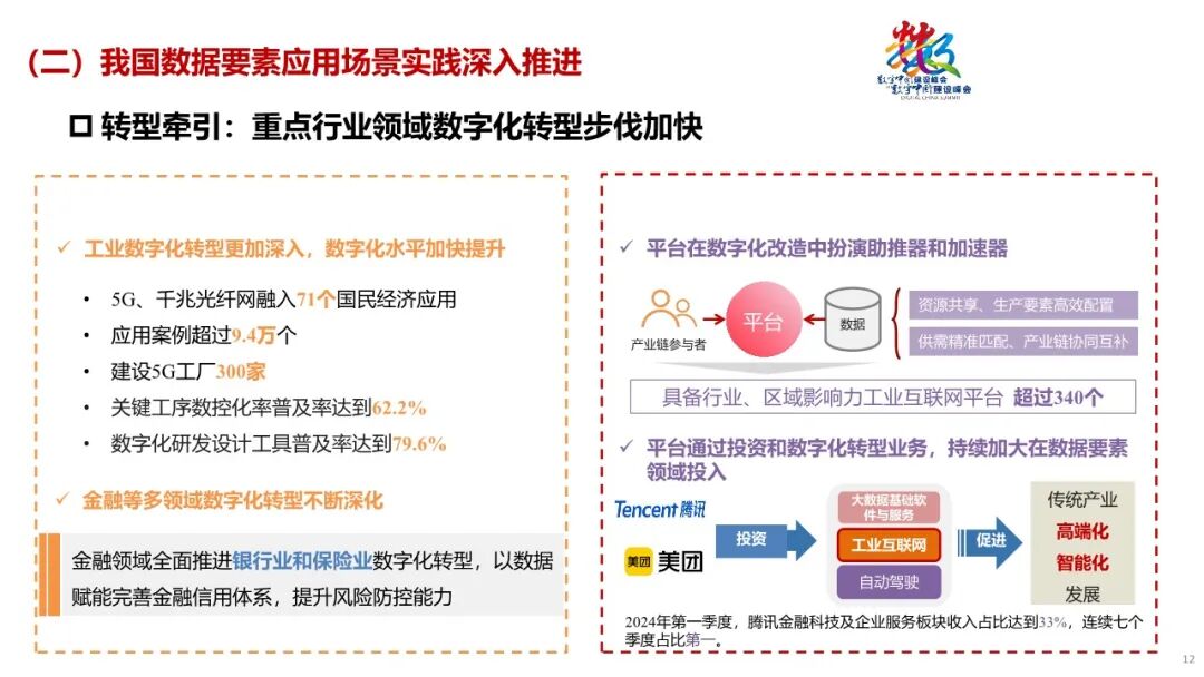 其次,报告从顶层设计、技术变革、流通提速、转型牵引、机制突破等角度归纳了我国数据要素发展的主要特点。具体包括:数据基础制度和管理体制建设加快、人工智能引领产业向数据驱动模式转型、合规监管和安全可信技术加速落地、重点行业领域数字化转型步伐加快、数据资产化制度探索路径逐步清晰等。其中,平台企业通过投资、云服务等业务,持续加大在数据要素领域投入。比如,腾讯在工业互联网、大数据基础软件与服务等领域的投资项目纳入了国家发展改革委和国家数据局的“绿灯”案例。2024年第一季度,腾讯金融科技及企业服务板块收入占比达到33%,连续七个季度占比第一,已成为腾讯未来增长的重要引擎。