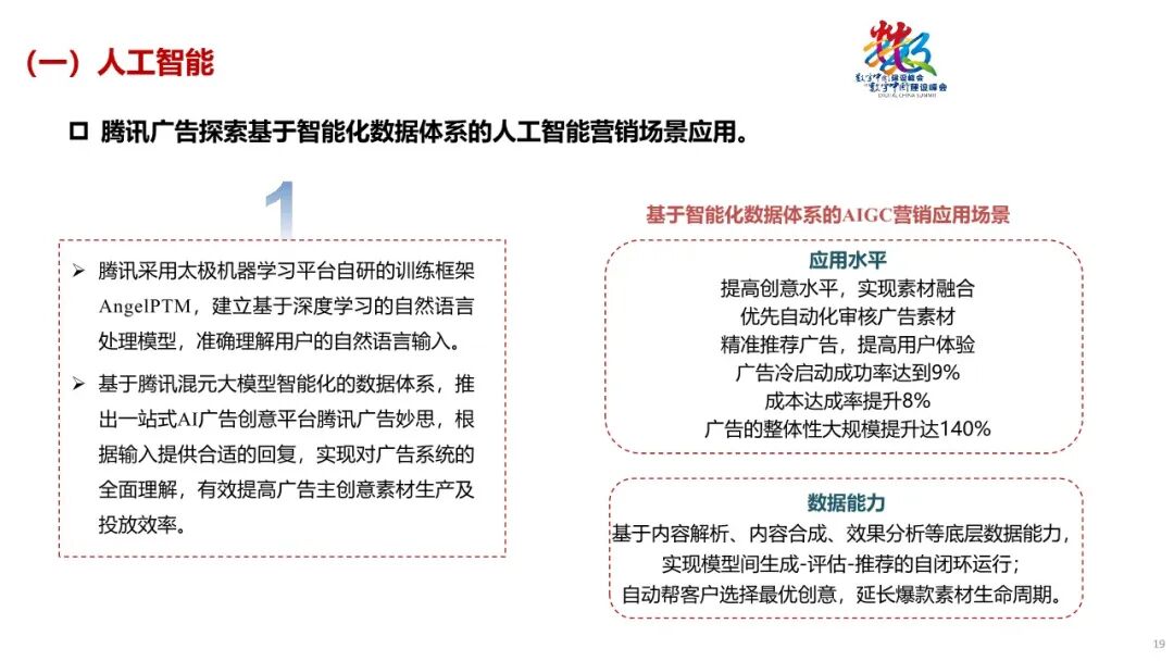 一是人工智能对于数据要素价值释放具有催化作用。比如,基于混元大模型推出的一站式AI广告创意平台腾讯广告妙思,立足行业痛点,不但可以大幅提高创意水平,满足个性化需求,在复杂语境下进行逻辑推理,通过AI创意工作台达成创意生成的降本增效,而且实现了“AIGC创意生产-直联投放流程-素材快速过审”的全链路打通,可以更精准、更高效地将广告推荐给合适的人群,提高用户体验以及广告转化效果。