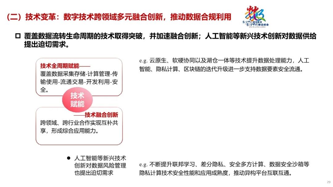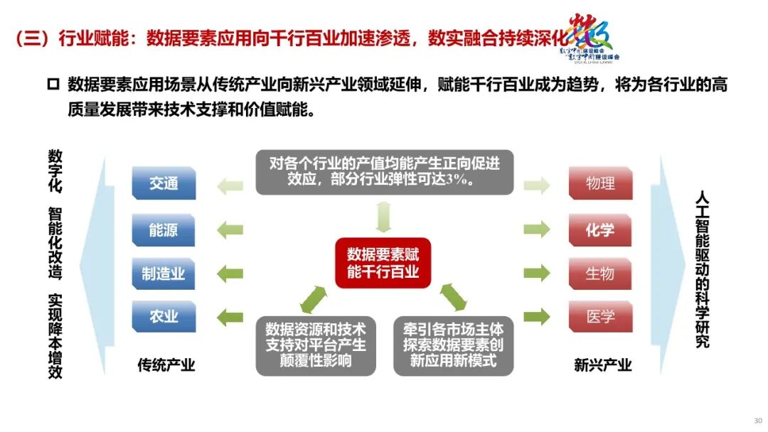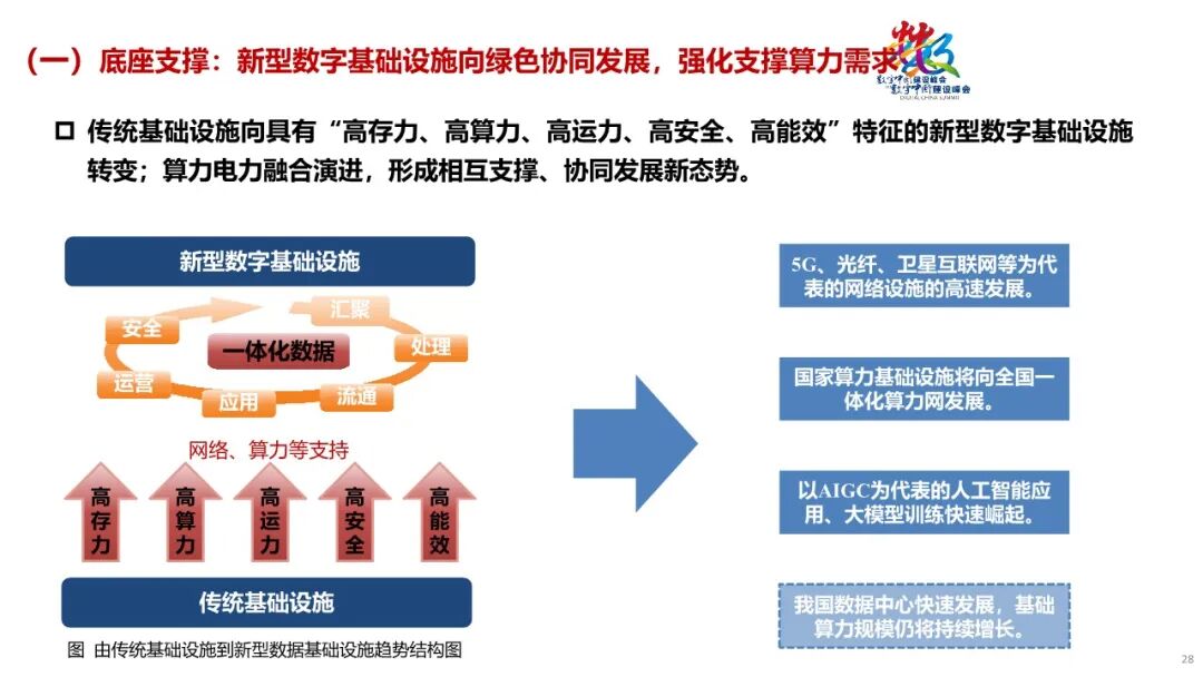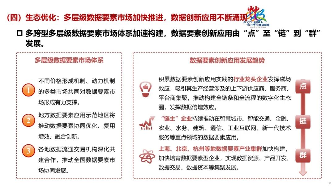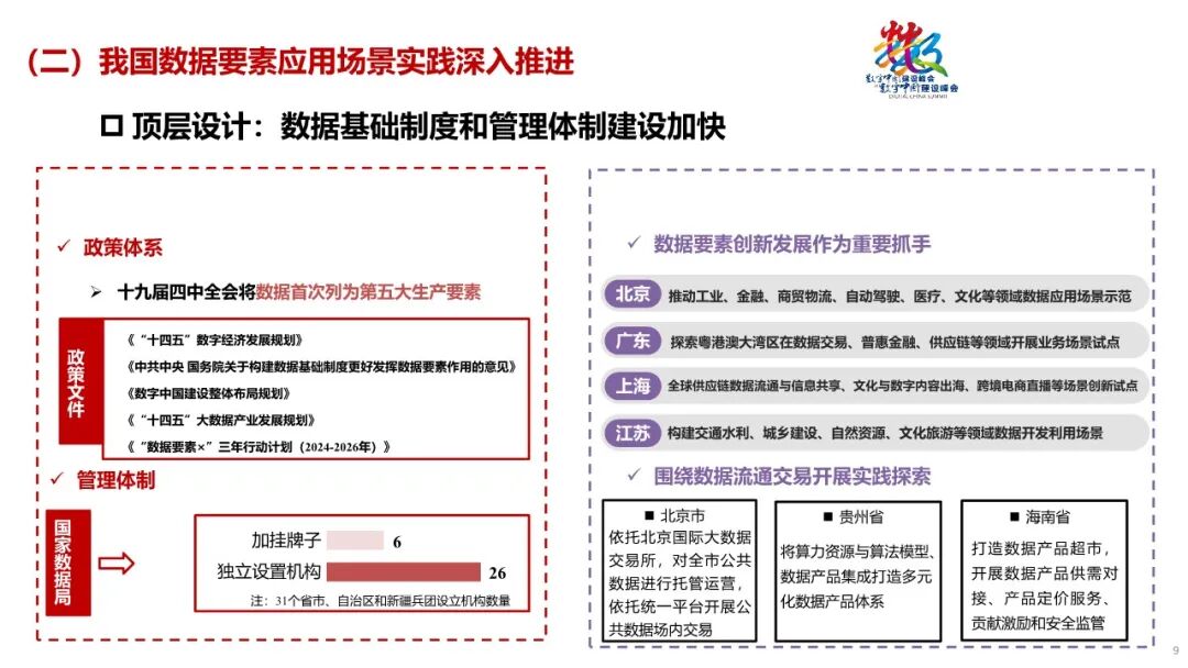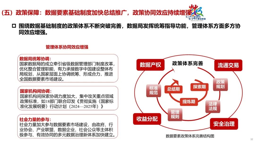 1. 底座支撑:新型数据基础设施向绿色协同发展,强化支撑算力需求。传统基础设施逐步向具有“高存力、高算力、高运力、高安全、高能效”特征的新型数据基础设施转变,算力电力融合演进,形成相互支撑、协同发展的新态势。2. 技术变革:数据要素技术跨领域多元融合创新,推动数据合规利用。覆盖数据流转全生命周期的数据技术取得突破,并加速融合创新。与此同时,人工智能等新兴技术创新对数据集提出迫切需求。3. 行业赋能:数据要素应用向千行百业加速渗透,数实融合持续深化。数据要素应用场景从传统产业领域向科学研究等新兴领域延伸,数据要素赋能千行百业成为趋势。4. 生态优化:多层级数据要素市场共同发展,数据要素产业加速壮大。数据交互、数据产品交易联动发展,数字化转型市场、数据原生企业构成的平台经济市场、场内数据交易市场等多类市场共同支撑数据要素市场繁荣发展。5. 政策保障:数据要素基础制度加快总结推广,政策协同效应不断增强。涵盖数据产权、流通交易、收益分配、安全治理等方面内容的制度探索在全国各地展开。国家和省级数据局发挥了越来越多的统筹指导功能,数据管理体系中的多方协同效应不断增强。