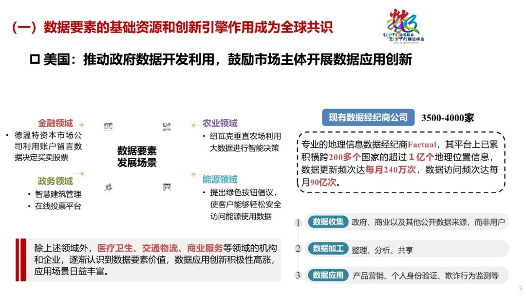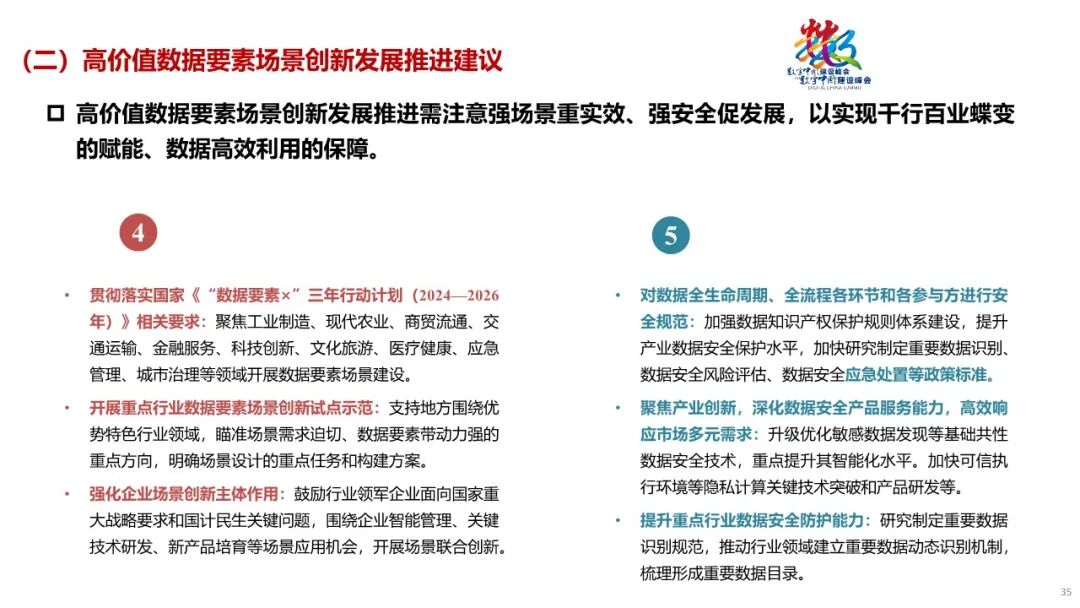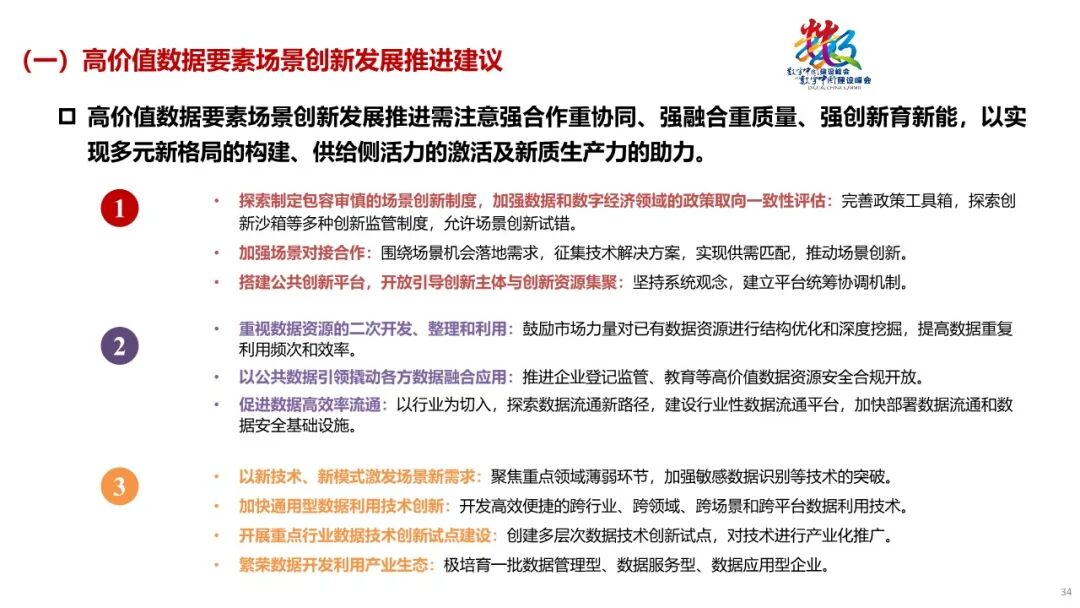 一是强合作重协同,共建多元新格局。探索制定包容审慎的数据要素场景创新制度,加强数据和数字经济领域的政策取向一致性评估。二是强融合重质量,激发数据要素活力。以公共数据开放引领数据融合应用,推进交通运输、气象等高价值数据资源安全合规开放。鼓励市场主体对已有数据资源进行结构优化和深度挖掘,提高数据开发利用水平。三是强创新育新能,助力新质生产力。鼓励人工智能、隐私计算、区块链等技术创新应用,以新技术、新模式激发场景新需求。四是强场景重实效,赋能千行百业蝶变。发挥企业在场景识别和创新中的主体作用,以需求为导向,鼓励民营企业与央国企、科研机构开展场景联合创新。五是强安全促发展,保障数据高效利用。在个人信息匿名化、个人信息去标识化、敏感个人信息保护等方面,逐步完善个人信息保护的实施标准或指南。在保护数据安全的同时,为数据要素产业发展留足空间。