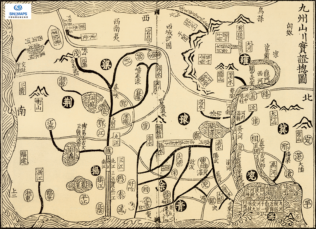 《九州山川实证总图》出自程大昌编撰的历史地图集《禹贡山川地理图》,淳熙八年(1181年)由彭椿年刊刻。