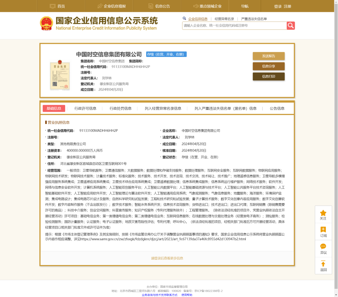 据国家企业信用信息公示系统,中国时空信息集团有限公司(以下简称“中国时空信息”)于4月20日在雄安新区注册成立,注册资本40亿元。