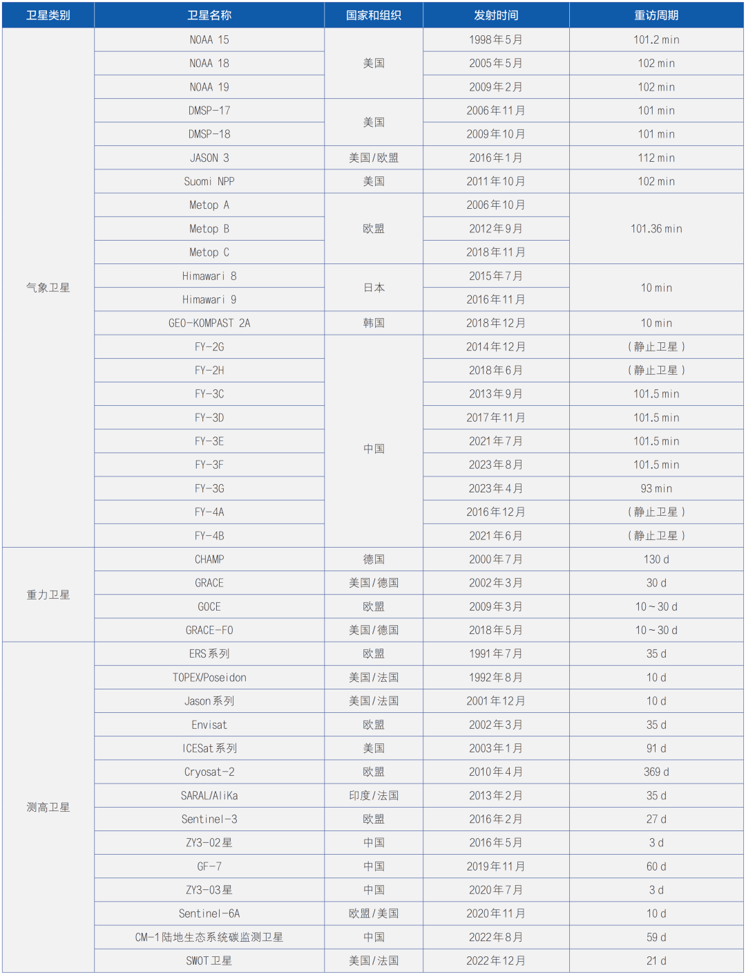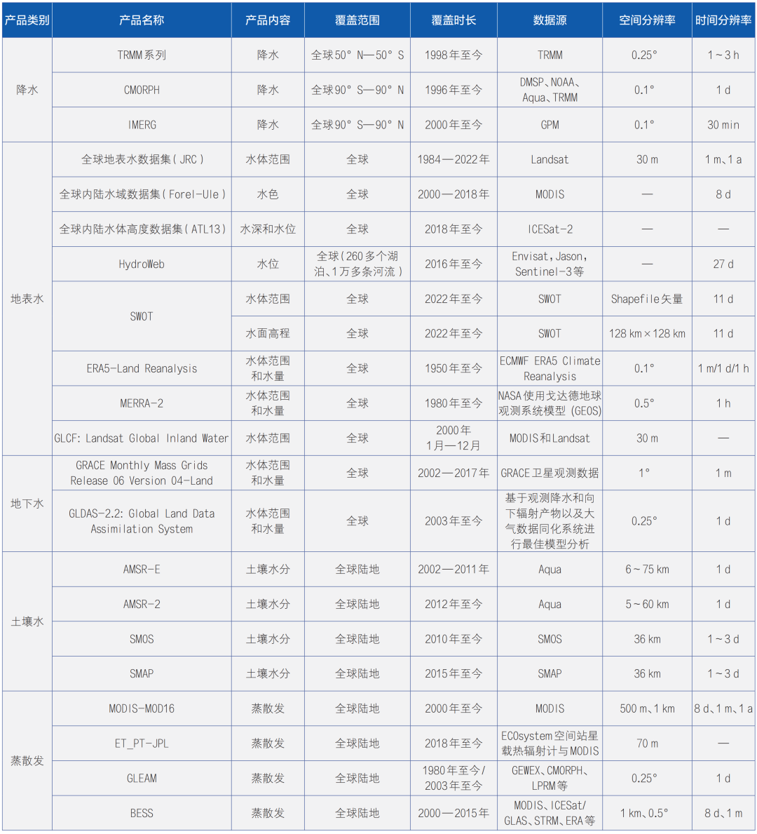 目前,已经应用在水利业务的遥感卫星主要包括:提供降水等气象数据的风云系列气象卫星、日本的“葵花”卫星等系列卫星;用于陆表蒸散发、冰雪厚度、土壤水分等关键涉水要素反演光学、热红外和微波等系列卫星(如MODIS、高分系列、Landsat、哨兵等);用于河湖水文参量精准监测的SWOT卫星等;分析陆表水储量变化的重力卫星(GRACE);用于估算地表湖库水位变化的Topex/Poseidon、Envisat RA-2、Jason-1/2等测高卫星。