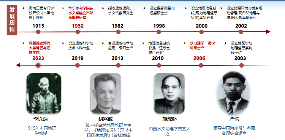 河海大学地理与遥感学科历史悠久,1915年河海工程专门学校成立之初,即开始开设《本国地理》课程;1952年,在当时的华东水利学院(河海大学前称)水文系首开自然地理教研室,著名地理学家胡豁咸先生担任教研室主任;1982年,开始招收遥感遥测硕士生;1998年,获准招收摄影测量与遥感硕士生。