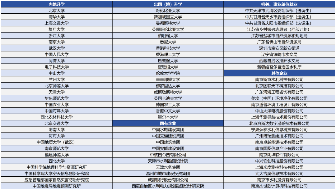 学院面向江河战略的国家需求和水利高质量发展的行业需求,优化教育资源供给,贯通生涯教育,高质量开展就业工作。学院升学就业呈现多元化与广泛化特点。学院本科生、研究生就业率均达97%以上,本科生升学率达50%以上,其中三分之二以上学生前往北京大学、南京大学、复旦大学、武汉大学、中国科学院地理科学与资源研究所、中国科学院空天信息创新研究院等高校和研究所继续深造。毕业生在水利、国土、交通、农业、城建、环保等行业和部门从事相关的科研、教学、设计、生产及管理等工作,同时,毕业生在城市规划、环境保护、灾害监测和资源调查等领域也发挥了重要作用,深受社会欢迎。