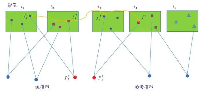 按需匹配对的核心思想是源模型ms的图像数量远少于参考模型mr的图像数量,那么可只使用与源模型图像相关的特征匹配来构建映射关系。如图6所示,源模型和参考模型使用图像i1、i2、i3和i4构建匹配图,其特征匹配的映射关系采用黄线表示。基于建立的匹配图,公共三维点集合CP的查找步骤为:①对于源模型中的每个三维点,找到其特征点