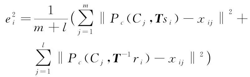 式中,m表示参考模型中影像数量;l表示源模型中影像数量;Pc(Cj,Tsi)表示三维点si在相机Cj上的投影点;xij表示三维点si在相机Cj上对应的影像点。本文设定最大残差为1.8像素,以区分变换T下的内点和外点。