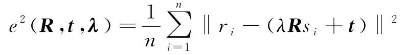 式中,R和t分别是旋转矩阵和平移向量;λ是缩放因子;e2是在变换矩阵T下si到ri的均方误差。式(7)所表示的最小化问题可通过SVD(singular value decomposition)算法求解[27]。考虑到子场景对应三维点数量远大于影像数量,本文将三维点作为对应几何元素。
