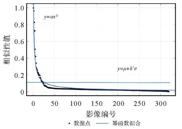 式中,a和b是幂函数系数;x和y分别是影像编号和相似性值。可以看出,幂函数能够很好地拟合数据点。然后统计数据点相似性值的均值μ和标准差σ,并定义式(3)所示的截断函数