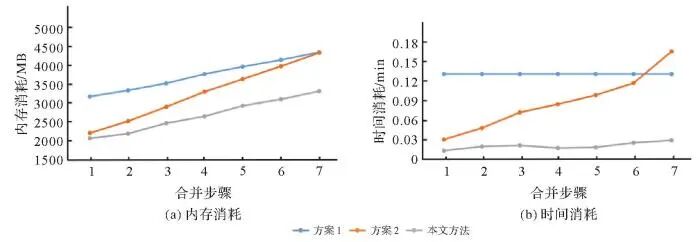 (2) 基于按需匹配图子模型合并的内存和时间消耗分析。利用数据集1对比分析按需匹配图子场景合并方法的内存和时间消耗,如图11所示。方案1利用所有影像建立匹配图[28];方案2利用两个待合并子场景的影像构建匹配图[19]。方案1子场景合并的内存消耗最高;方案2在开始阶段的内存消耗与本文方法相当,但其内存消耗不断增加,最终与方案1相当。本文方法的内存消耗在整个合并过程中最低,与方案1相比减少了1.05 GB。另外,本文方法的时间消耗也最小,在整个子场景合并过程中基本保持不变。因此,基于按需匹配图能够实现更小内存消耗、更高效的子场景合并。