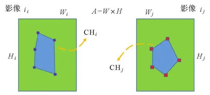 式中,Ninlier和Nmax_inlier分别是影像匹配对pij的匹配点数量和所有匹配对P中最大匹配点数量;CHi和Ai分别是匹配点凸多边形面积和对应影像面积,如图4所示。根据试验结果,本文的后续试验设定Rew=0.5。