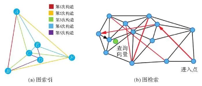 (3) HNSW索引与检索。针对高维向量检索的高时间代价,本文利用HNSW图索引构建VLAD高维向量索引结构,实现高效的影像匹配对检索[23]。HNSW的基本原理是将待索引向量构造成图结构G={V,E}。其中,V和E分别表示待索引向量组成的顶点集合及其连接关系组成的边集合。为了实现高效索引和检索,HNSW要求构图时所有节点需存在邻居(连接顶点),且邻居数要尽可能少。同时,距离相近的顶点须互为邻居。其中,最大邻居数量M是图索引结构构建时间成本和检索精度的重要因子。图2展示了HNSW图构造与图索引原理。图构造时,规定M=3,6个待索引向量通过5次构造实现图索引,分别插入顶点A、B、F、C、E和D。当图中顶点数大于M时,通过图检索(图2(b))查找最近邻的M个顶点,直接连接待插入顶点与M个最近邻顶点。图检索时,随机选择一个顶点作为进入点,查找其距离查询向量最近的邻居,并以此邻居作为当前进入点;迭代上述步骤,直到满足终止条件,得到查询向量的检索结果。