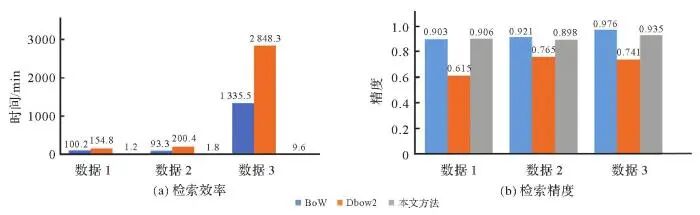 匹配对检索的统计结果如图14所示。与BoW和Dbow2相比,本文方法效率最高,3个数据集的时间消耗为1、2、1.8和9.6 min。对于数据集3,BoW和Dbow2的时间消耗分别为1 335.5和2 848.3 min。对于检索精度,BoW的性能最好,3个数据集的精度分别为90.3%、92.1%和97.6%。本文方法的精度为90.6%、89.8%和93.5%,略低于BoW方法,但均高于Dbow2。综上所述,本文方法能够实现高效、精确的匹配对选择;与BoW相比,它在3个试验数据集上的加速比达到36~108。