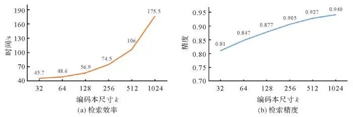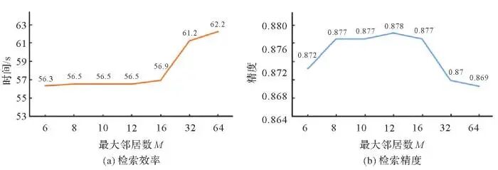 (1) VLAD聚合编码本尺寸k和HNSW最大邻居数M分析。利用数据集1分析编码本尺寸k和最大邻居数M对检索效率和精度的影响。检索效率指VLAD特征聚合、HNSW图索引构建和影像检索的时间消耗;检索精度是正确匹配对与所有匹配对的比值。每张影像检索30张影像,匹配点数超过15的影像对记为正确匹配对。编码本尺寸k取值为32、64、128、256、512和1024,试验结果如图9所示。图9结果表明:①影像检索时间消耗随着k增加而指数增长,从45.7 s增加至175.5 s,主要原因是VLAD特征聚合时间和描述符维度增加,导致图索引构建和影像检索计算量增加。②检索精度随着k增加而线性增加,从0.81增加到0.94。综合检索效率和精度,后续试验设置k为256。另外,最大邻居数M取值为6、8、10、12、16、32和64,试验结果如图10所示。可以看出:①检索效率的变化趋势分为两部分。当M取值从6增加到16时,检索效率基本保持不变;当M值从16增加到64时,检索效率急剧下降。②检索精度的变化趋势分为3个阶段。M值从6增加到8,检索精度明显提高;检索精度在8~16范围内保持不变;检索精度在16~64范围内逐渐降低。因此,后续试验参数M设置为16。