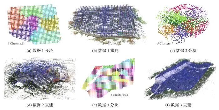 添加到尺寸较小的子场景 G*=min(Gi,Gj),直到满足上述约束。通过上述大场景分割和子场景扩展步骤,可实现场景图G的分割。由于子场景SfM重建相互独立,因而可实现并行化处理。图5展示了场景分割与子场景SfM的重建结果。