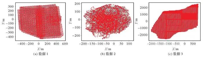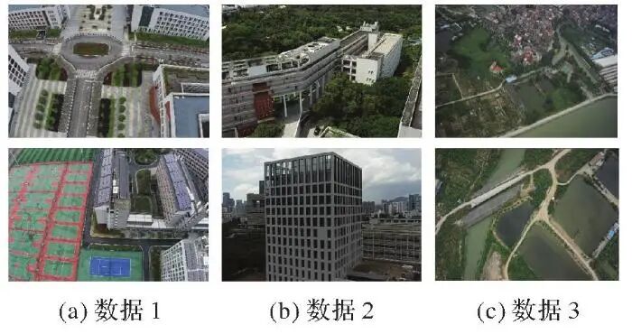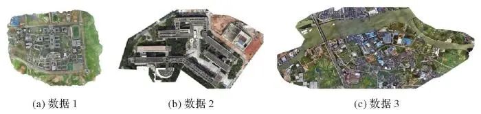 利用3组无人机影像进行试验,试验区正射图如图7所示。数据采集均采用多旋翼无人机,详细信息见表1。第1组数据包含密集低层建筑物,采用大疆精灵4 RTK无人机采集了3743张影像,部分影像如图8(a)所示。第2组数据包含复杂建筑结构,结合优视摄影测量技术,使用DJI M300 RTK无人机采集了4030张影像,部分影像如图8(b)所示。第3组数据集包含低层建筑和茂密植被,采用5台索尼ILCE-7R相机组成的倾斜摄影设备采集了21 654张影像,部分影像如图8(c)所示。