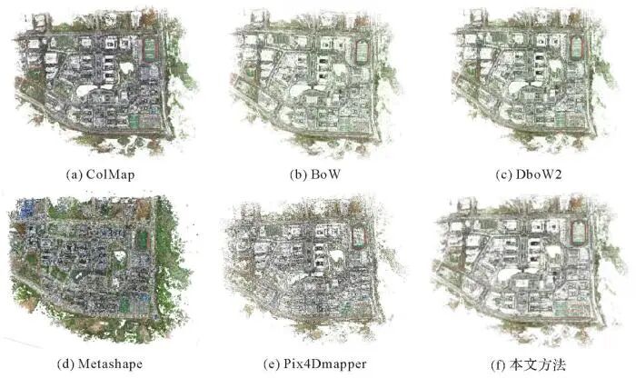 表4统计了三维重建结果。效率是不包含特征匹配的三维重建时间消耗;精度和完整度定义与表3相同。ColMap采用增量式SfM重建引擎;BoW和Dbow2采用本文的并行化SfM重建引擎;Metashape使用多尺度匹配和GNSS进行匹配对选择;Pix4Dmapper使用词汇树影像检索进行匹配对选择。可以看到:①仅采用增量式SfM的ColMap效率最低。采用本文的并行化SfM,BoW、Dbow2和本文算法的效率显著提升,加速比达到30倍以上,明显优于Metashape和Pix4Dmapper。因为内存不足,Metashape和Pix4Dmapper无法重建数据集3。ColMap重建数据集3的时间超过5 d,在此没有统计。②Pix4Dmapper的精度最高,其次是BoW、Dbow2和本文方法。对于重建完整度,除了Pix4Dmapper较低外,其余4个方案的完整度都相近,主要原因是Pix4Dmapper检索正确率较低。值得注意的是,尽管数据集2的影像数仅比数据集1多300张,但其重建时间消耗多4.4倍,主要原因是优视摄影的不规则数据采集方式增加了重建和合并难度。图15展示了6种方法数据1的重建结果。可以看出,本文方法生成的点云可覆盖整个试验区域。