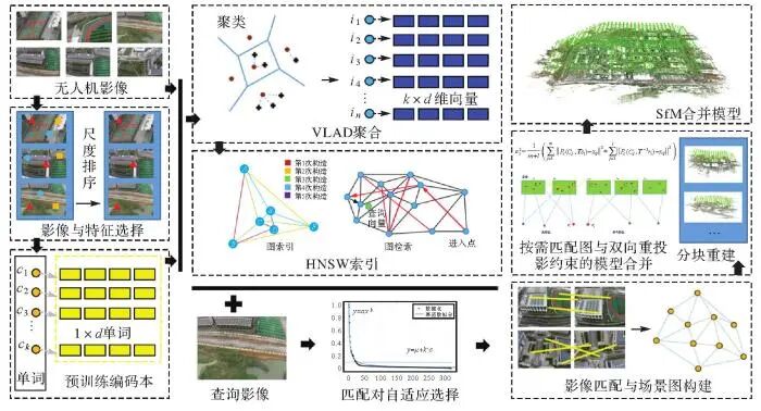 影像匹配对检索的目标是查找空间重叠的影像对,引导和加速特征匹配。本文提出了联合全局描述子和图索引的高效影像检索方法,其核心思想是一方面利用VLAD全局描述子减少局部特征点数量,加速影像索引构建;另一方面利用HNSW图索引实现高维全局描述子索引和最近邻搜索,最终加速影像匹配对选择。同时,考虑到现有方法常采用固定数量或比率确定检索影像数,存在匹配对数量过多或不足的问题,进一步提出自适应阈值匹配对选择算法。具体实现如下: