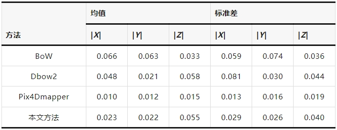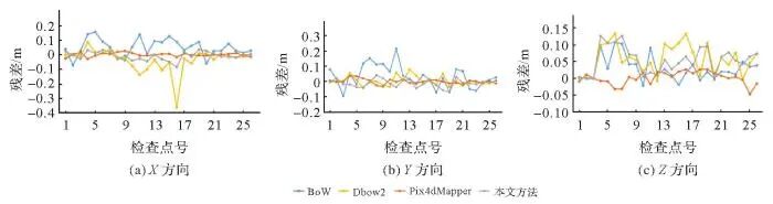 为了对比SfM重建的绝对精度,利用数据2中26个地面控制点进行绝对定向平差试验和精度分析。其中,3个均匀分布点作为控制点;其他点作为精度检查点。表5和图16统计了模型点坐标与地面点坐标之间的偏差。结果表明,Pix4Dmapper具有最高的精度,在X、Y和Z方向上残差分别为0.013、0.016和0.019 m。虽然BoW在垂直方向上精度排名第二,残差为0.036 m,但其水平精度低于本文方法。本文方法在X方向和Y方向上的残差为0.029和0.026 m。由于匹配对选择的精度较低,Dbow2的绝对定向精度在X和Z方向上最低,如图16(a)和图16(c)所示。综上所述,本文方法能够提供相当精度的相对定向和绝对定向三维重建模型。