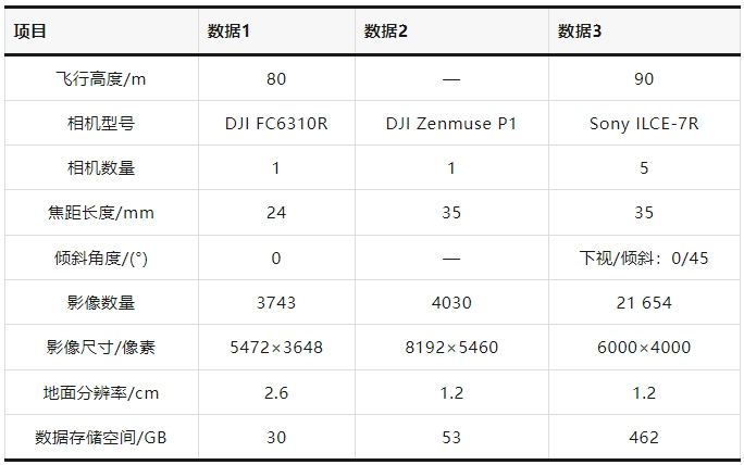 注:①对于数据3,ColMap的重建时间超过5 d;Metashape和Pix4Dmapper出现内存不足。②完整度指标括号外数值为重建三维点数量,括号内数值为成功定位定向的影像数量。