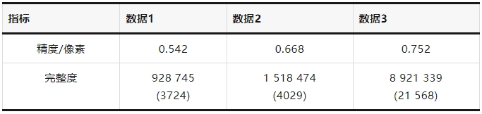 注:完整度指标括号外数值为重建三维点数量,括号内数值为成功定位定向的影像数量。
