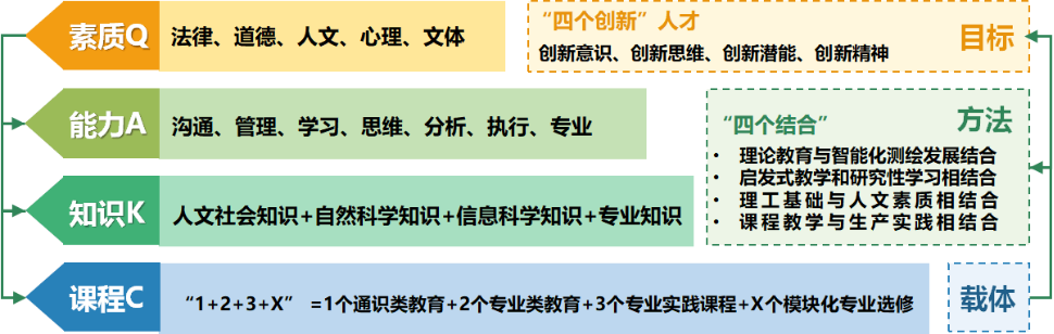(三)优化“QAKC”培养模式,构建“1+2+3+X”的交叉性、模块化课程体系和“四个结合”的教学方法,培养智能化测绘领军人才